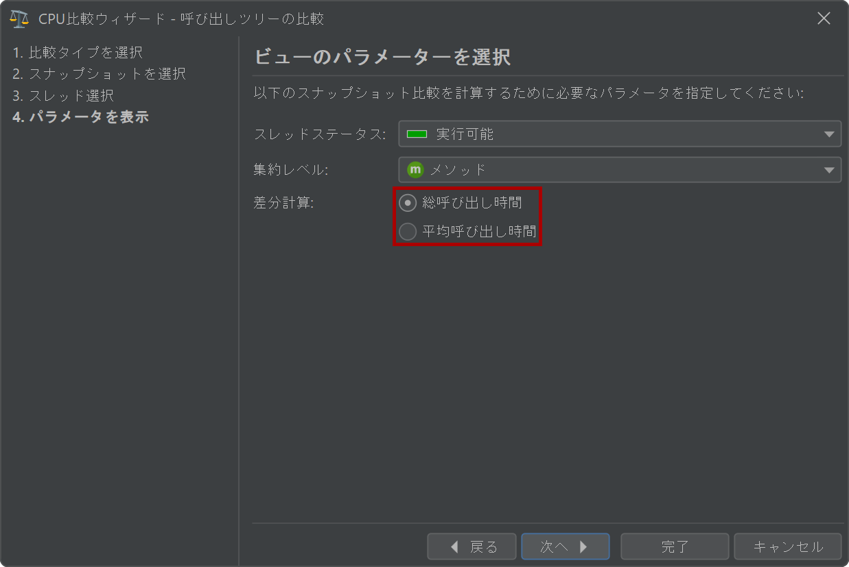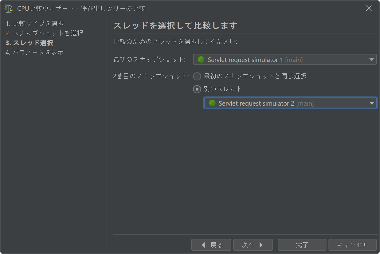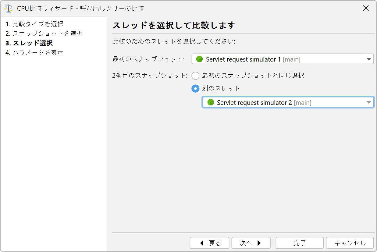 CPUの比較では、同じスナップショットを最初と2番目のスナップショットとして使用し、ウィザードで異なるスレッドやスレッドグループを選択できます。