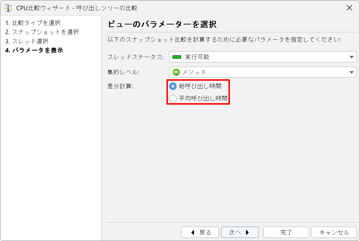 CPUおよびプローブ呼び出しツリーの比較では、合計時間ではなく平均時間を比較することが興味深いかもしれません。これはウィザードの「ビューのパラメータ」ステップで選択できるオプションです。