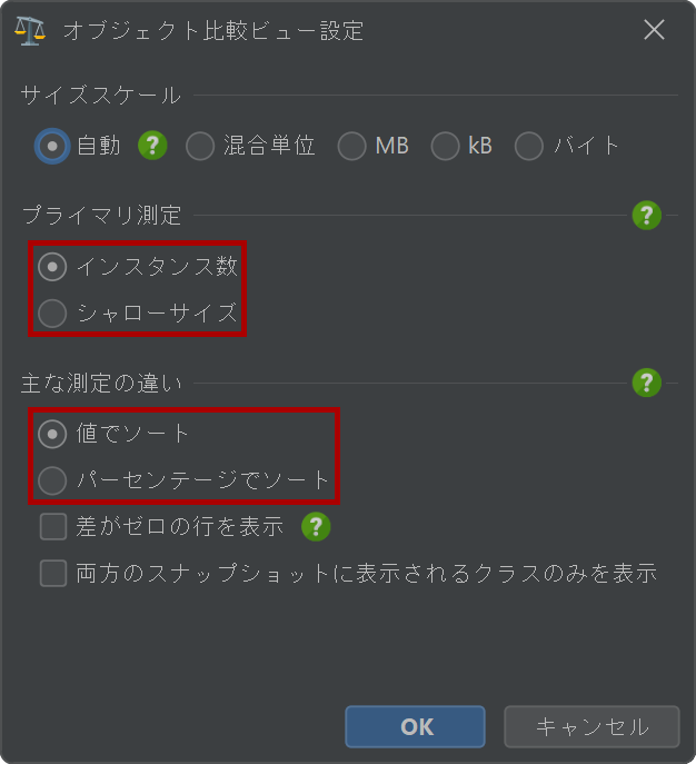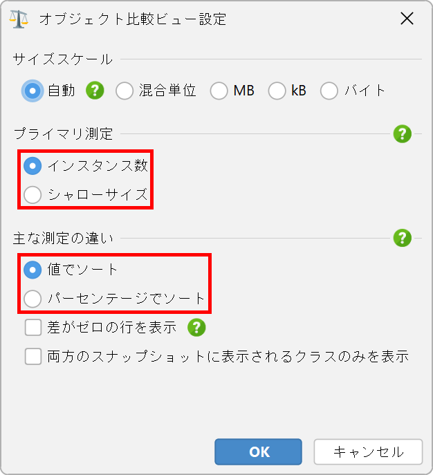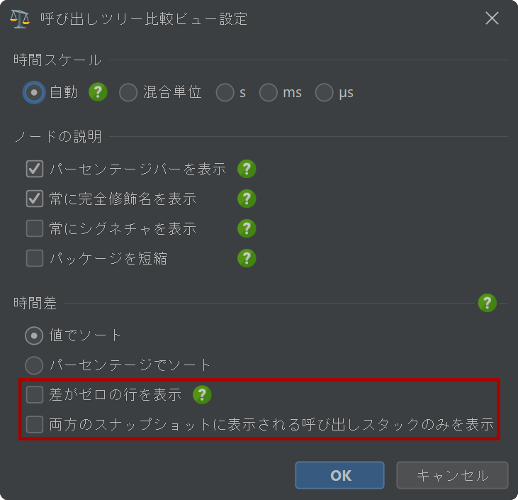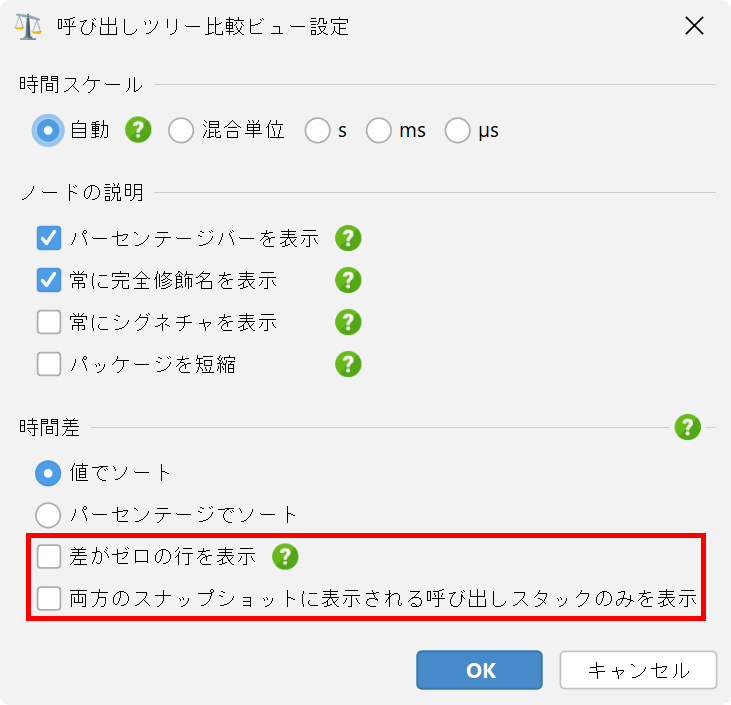 手元のタスクに応じて、両方のスナップショットファイルに存在し、一方のスナップショットファイルから他方に変化した呼び出しスタックのみを表示する方が簡単になる場合があります。この動作はビュー設定ダイアログで変更できます。