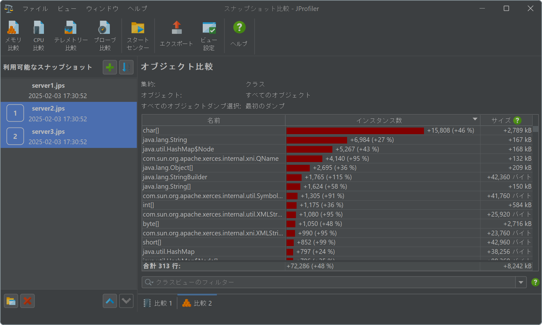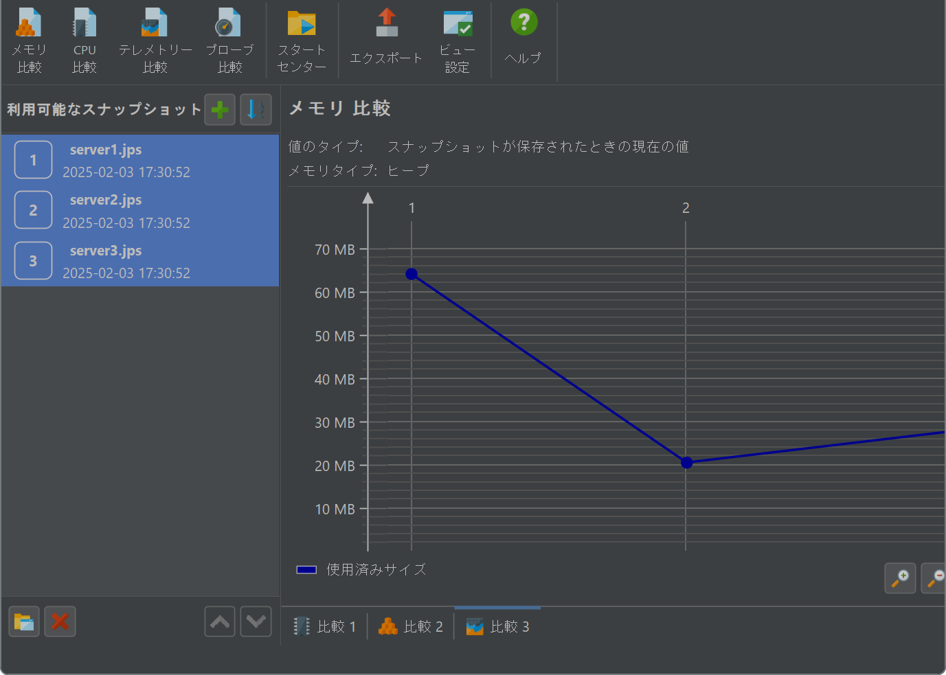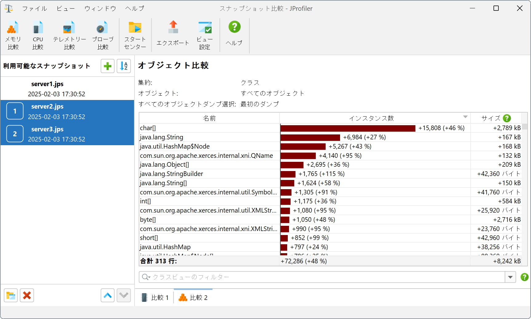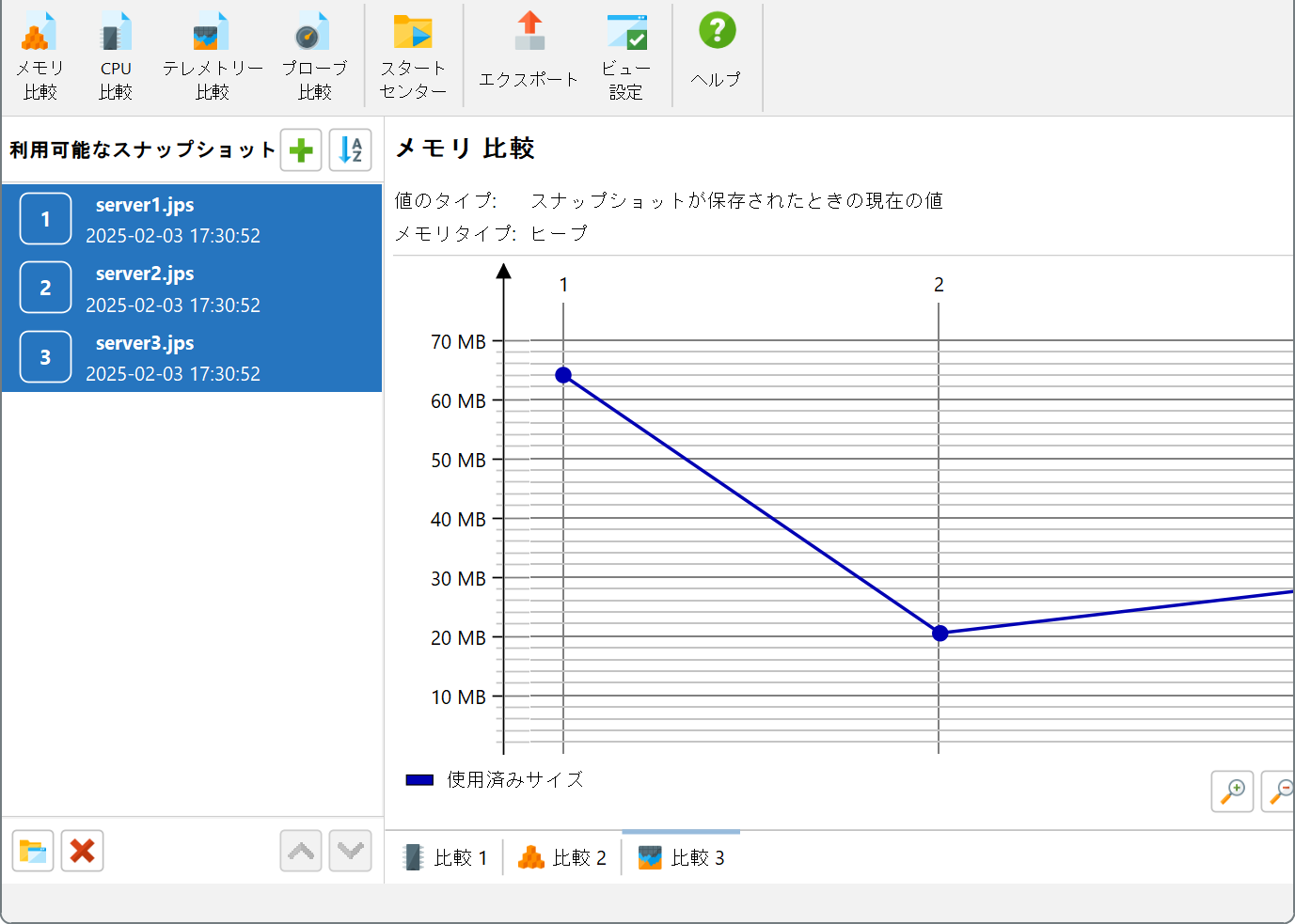 比較がアクティブな場合、分析されたスナップショットは番号のプレフィックスと共に表示されます。2つのスナップショットで動作する比較では、表示される差異はスナップショット2の測定値からスナップショット1の測定値を引いたものです。