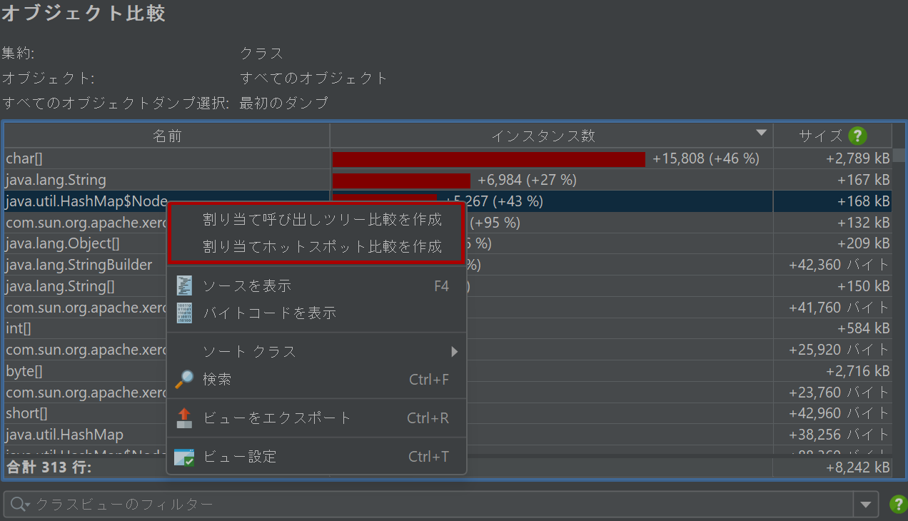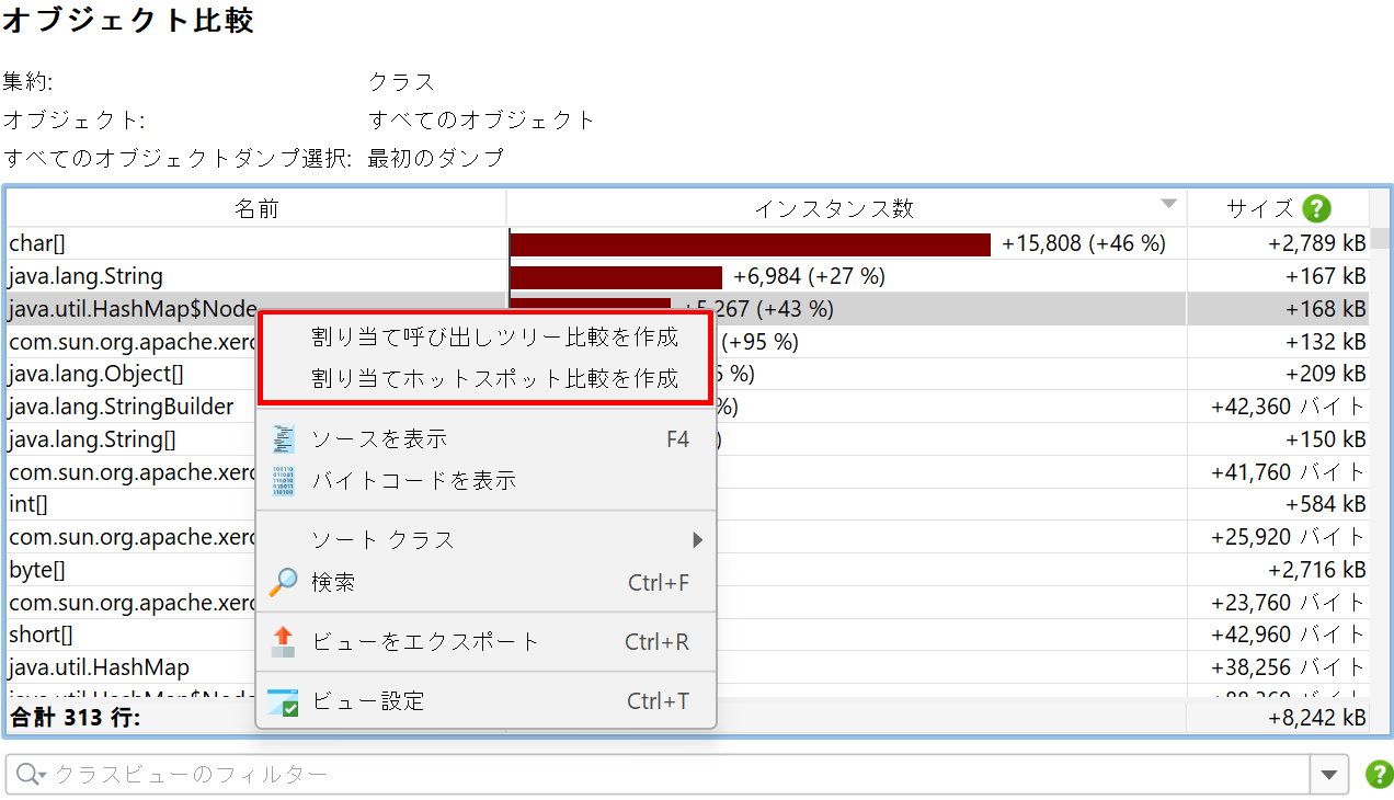テーブルのコンテキストメニューから、同じ比較パラメータで選択されたクラスの他のメモリ比較にショートカットできます。