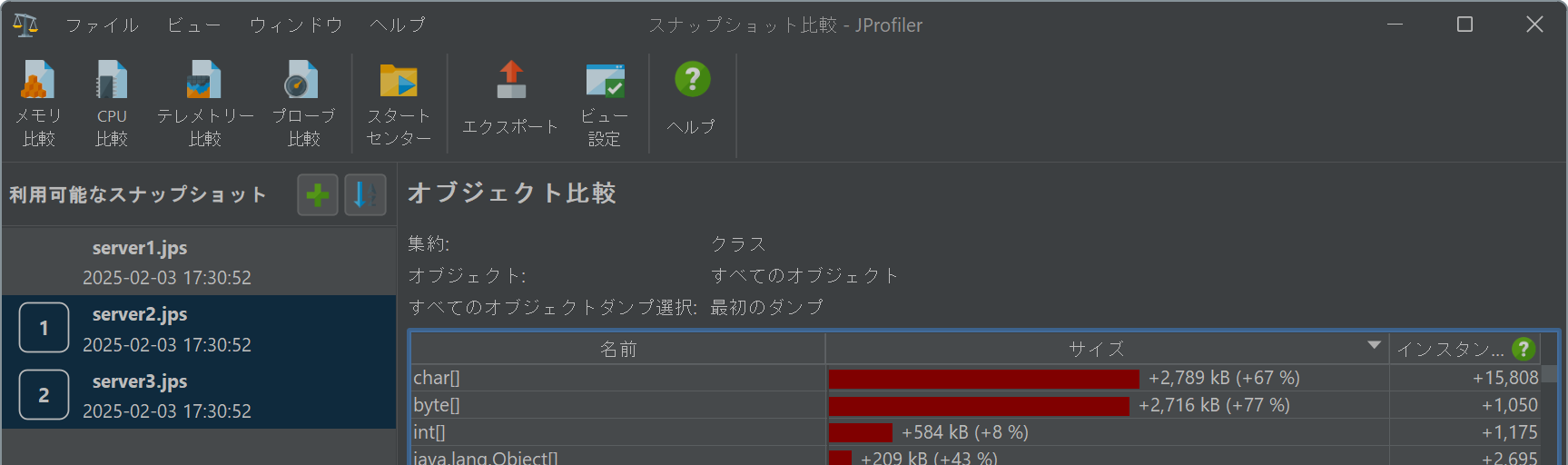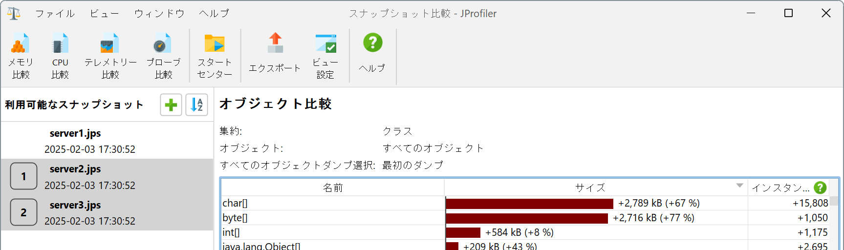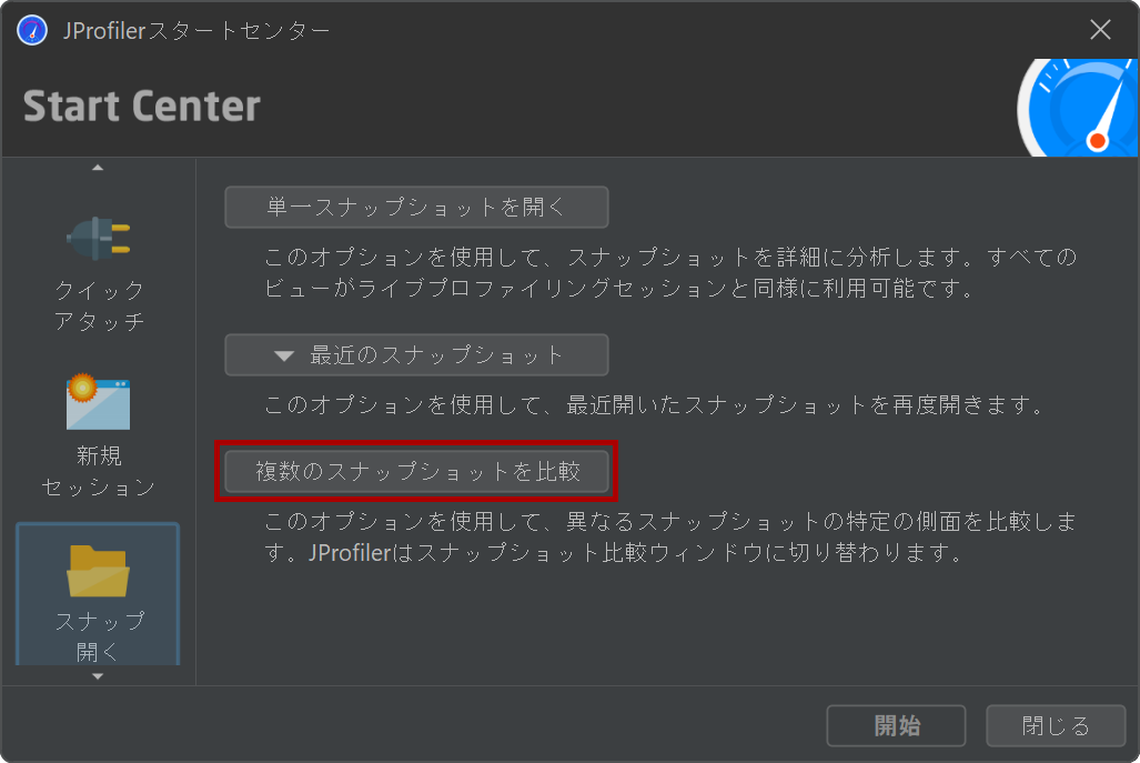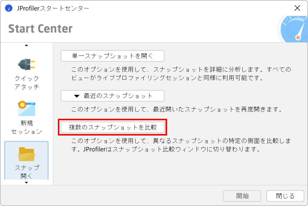 現在のアプリケーションのランタイム特性を以前のバージョンと比較することは、パフォーマンスの退行を防ぐための一般的な品質保証技術です。また、単一のプロファイリングセッション内でパフォーマンス問題を解決する際にも役立ちます。異なるユースケースを比較して、なぜ一方が他方よりも遅いのかを見つけることができます。どちらの場合も、関心のある記録データを含むスナップショットを保存し、セッション→新しいウィンドウでスナップショットを比較メニューから呼び出すか、スタートセンターのスナップショットを開くタブで複数のスナップショットを比較ボタンをクリックして、JProfilerのスナップショット比較機能を使用します。
