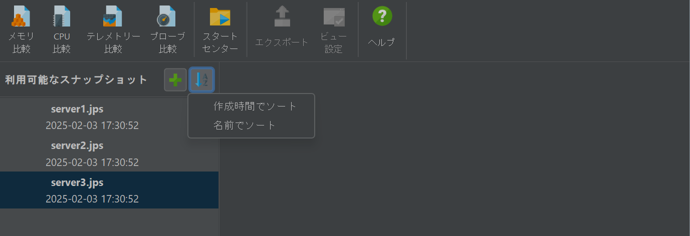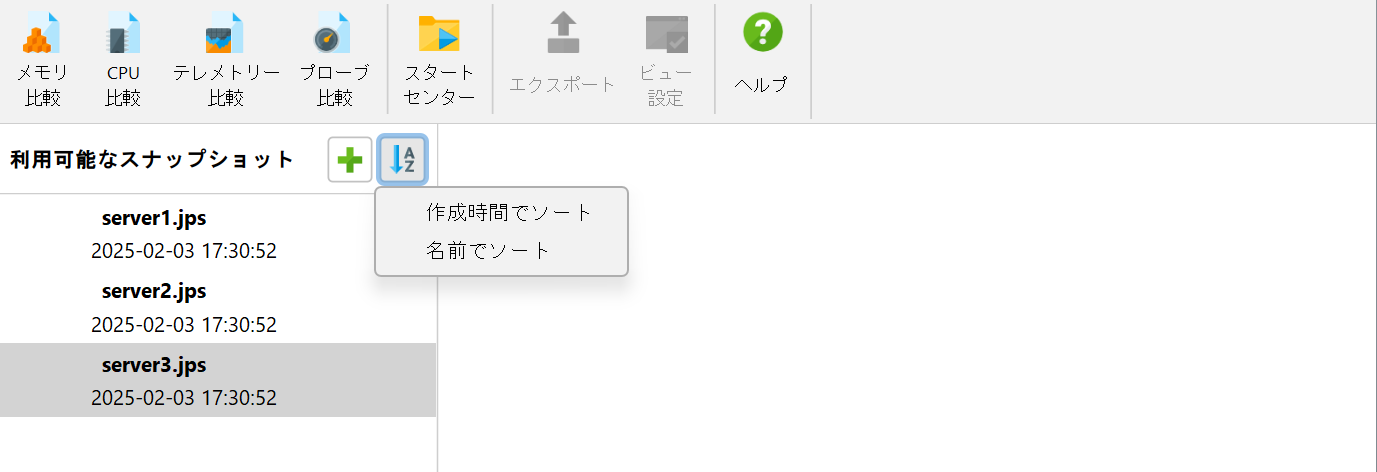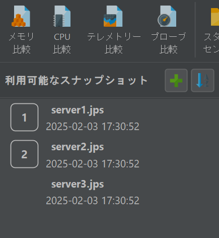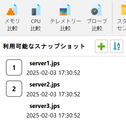 比較は、別のトップレベルウィンドウで作成および表示されます。まず、スナップショットセレクタにいくつかのスナップショットを追加します。その後、関心のあるスナップショットを選択し、比較ツールバーのボタンをクリックすることで、リストされたスナップショットのうち2つ以上から比較を作成できます。リスト内のスナップショットファイルの順序は重要です。すべての比較は、リストの下の方にあるスナップショットが後の時間に記録されたと仮定します。スナップショットを手動で配置する以外に、名前や作成時間でソートすることもできます。