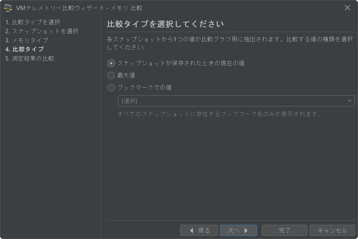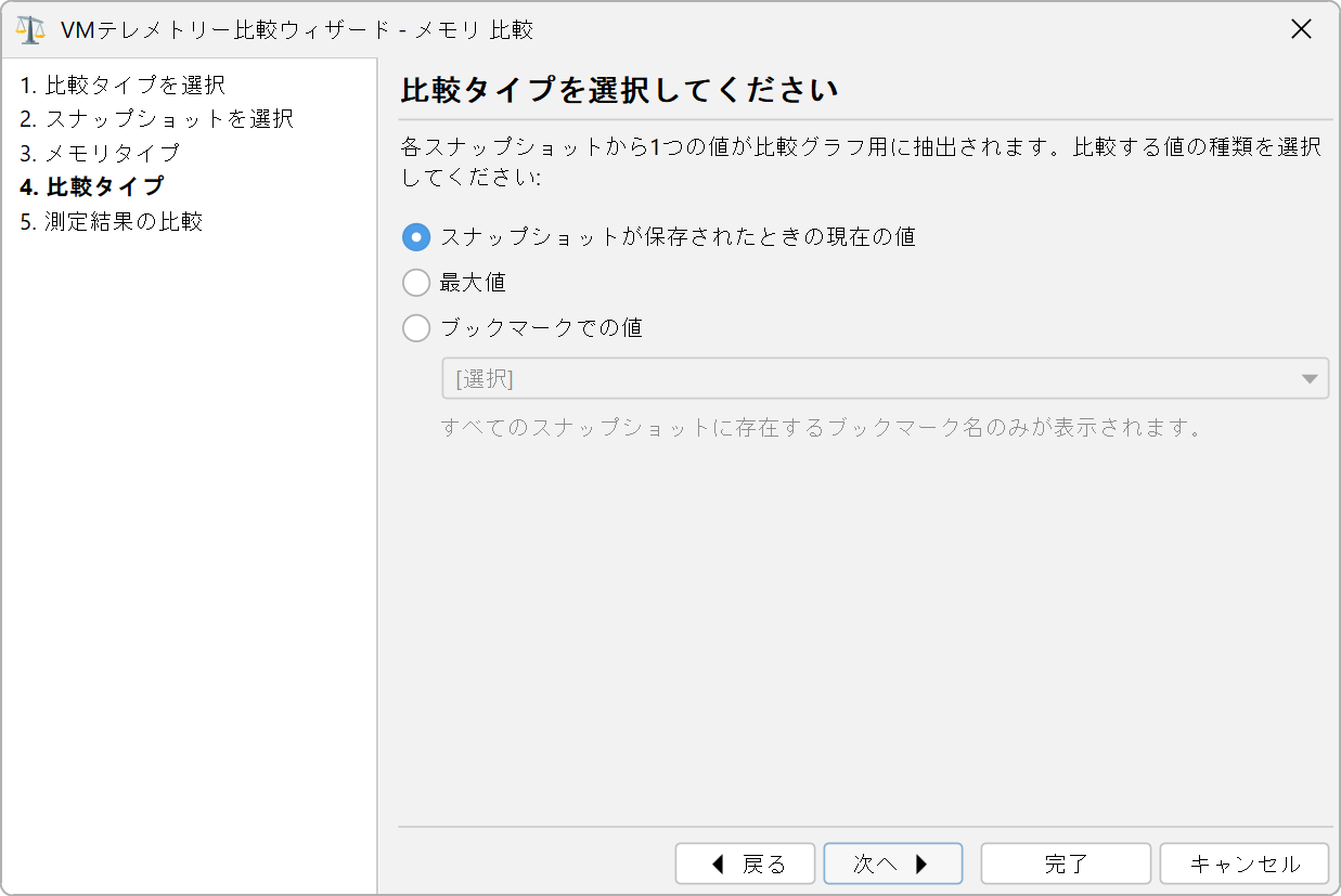 比較は各スナップショットから1つの数値を抽出します。テレメトリーデータは時間解決されているため、これを行う方法は複数あります。ウィザードの「比較タイプ」ステップでは、スナップショットが保存されたときの値を使用するか、最大値を計算するか、選択されたブックマークでの値を見つけるオプションを提供します。