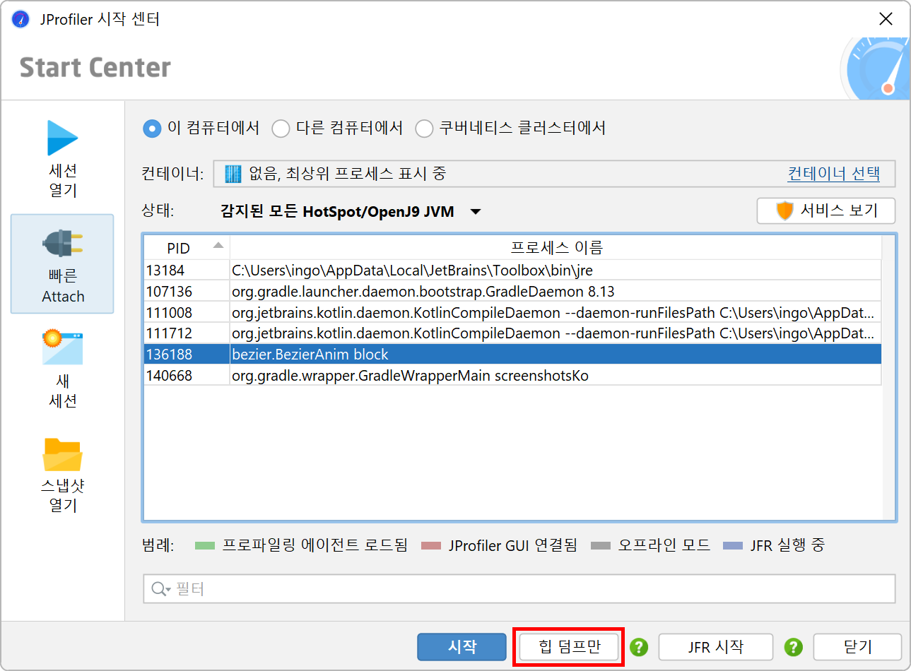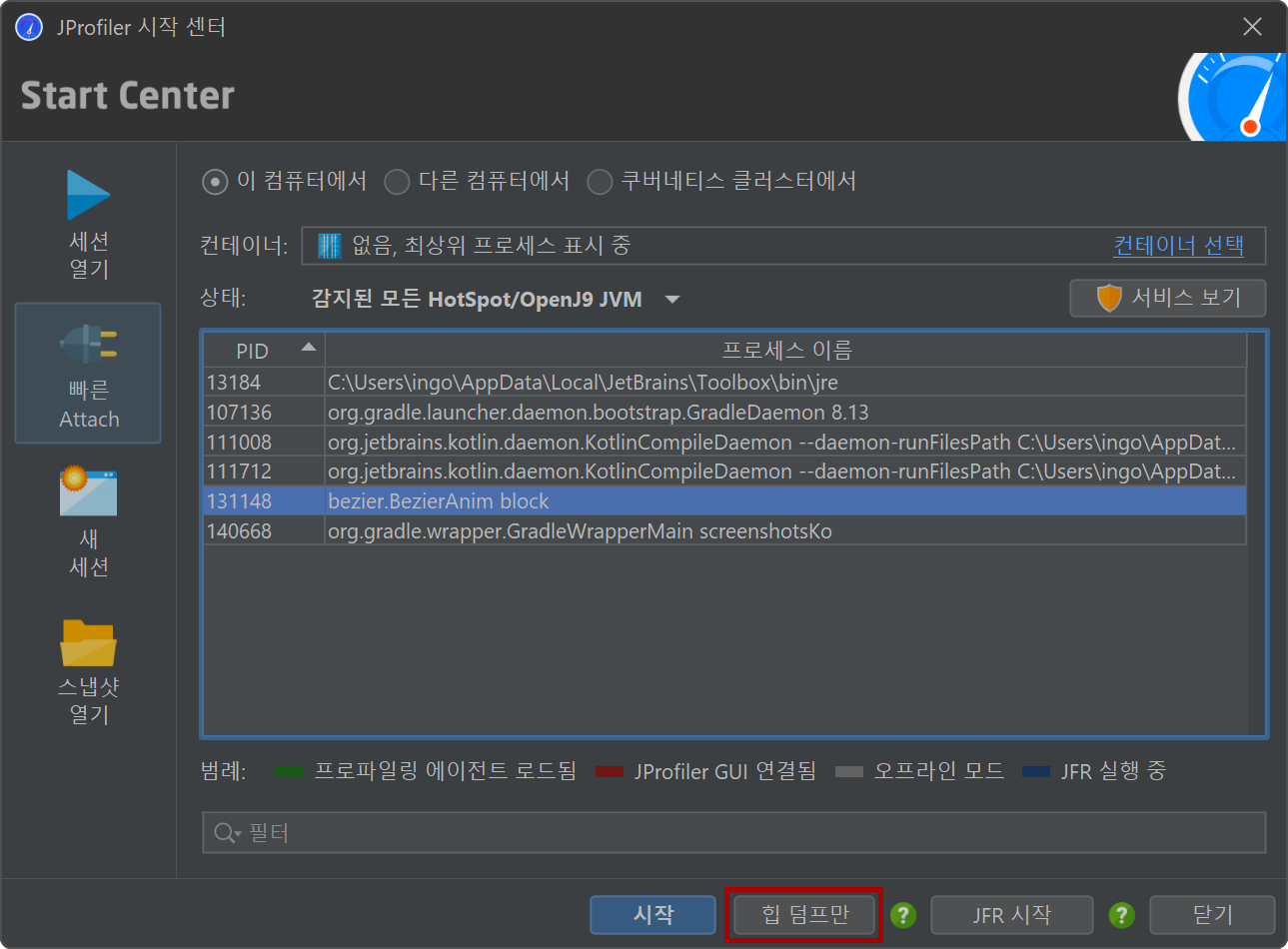 프로파일링 에이전트를 로드하지 않고 HPROF 힙 스냅샷을 찍는 것도 JProfiler GUI에서 지원됩니다. 프로세스에 로컬 또는 원격으로 attach할 때, 항상 HPROF 힙 스냅샷을 찍을 수 있는 가능성이 있습니다.