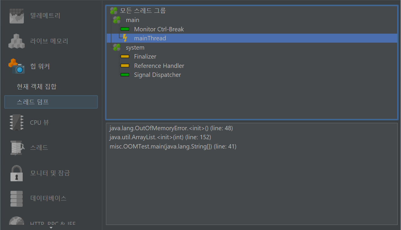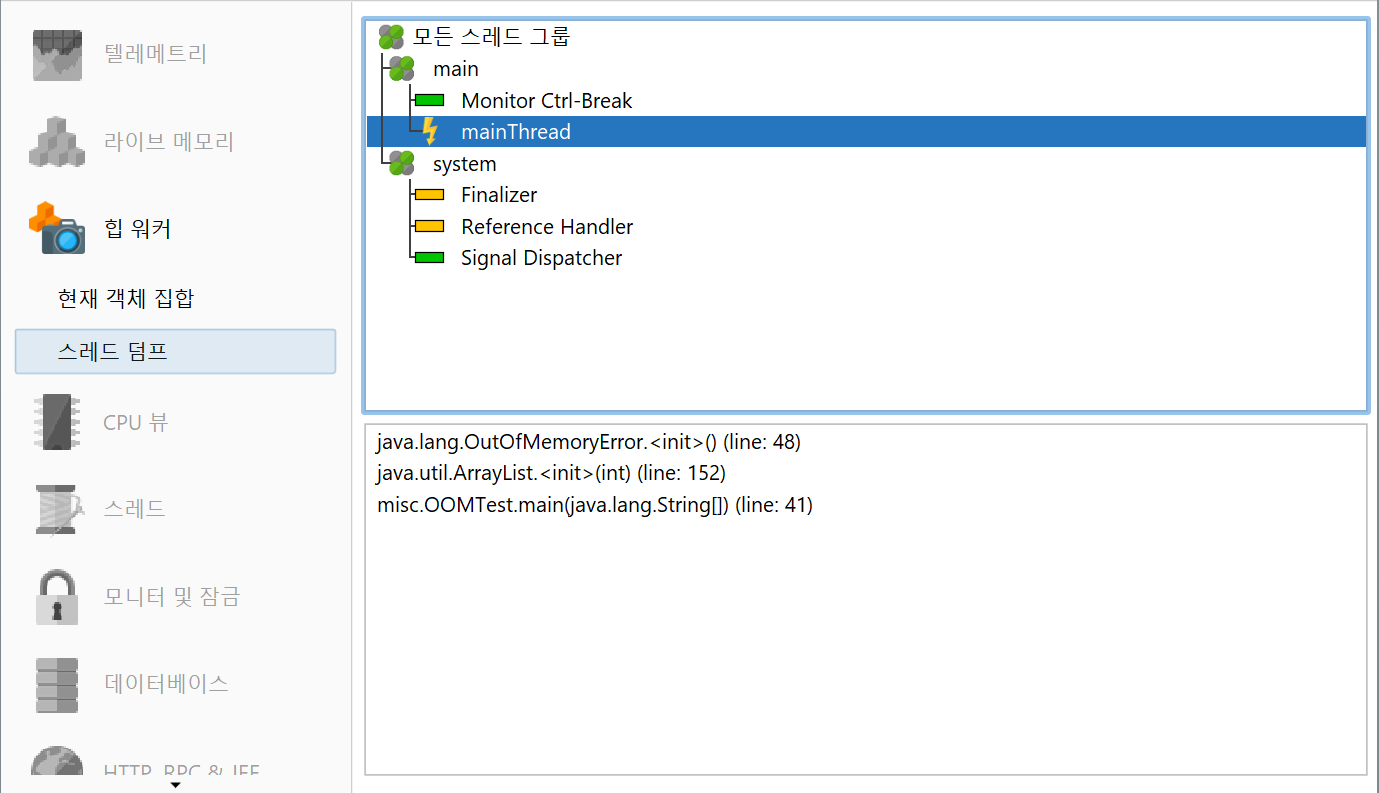 OutOfMemoryError의 결과로 저장된 경우, 스레드 덤프는 오류 당시 애플리케이션의 어느 부분이