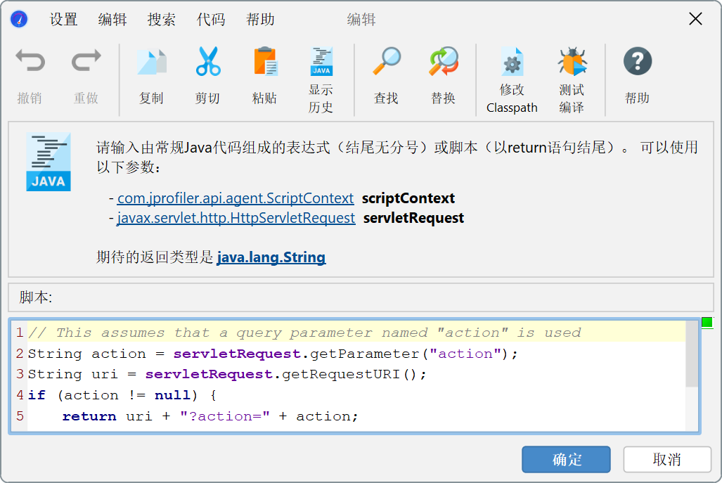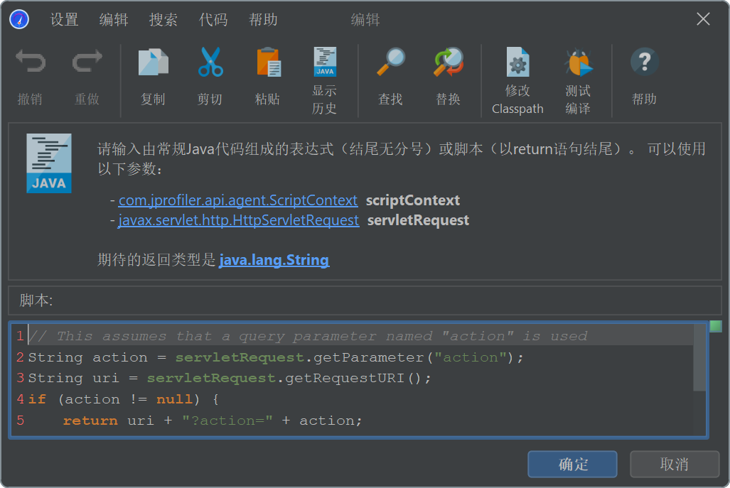 JProfiler内置的脚本编辑器允许你在JProfiler GUI的各个地方输入自定义逻辑, 包括自定义探针配置、拆分方法、堆遍历器过滤器等等。