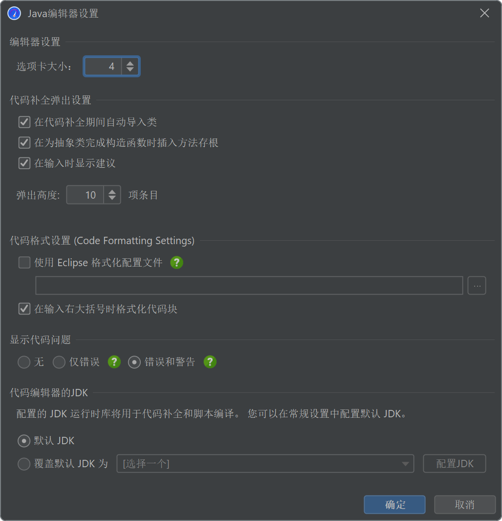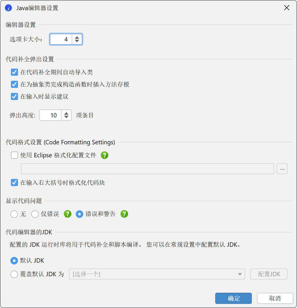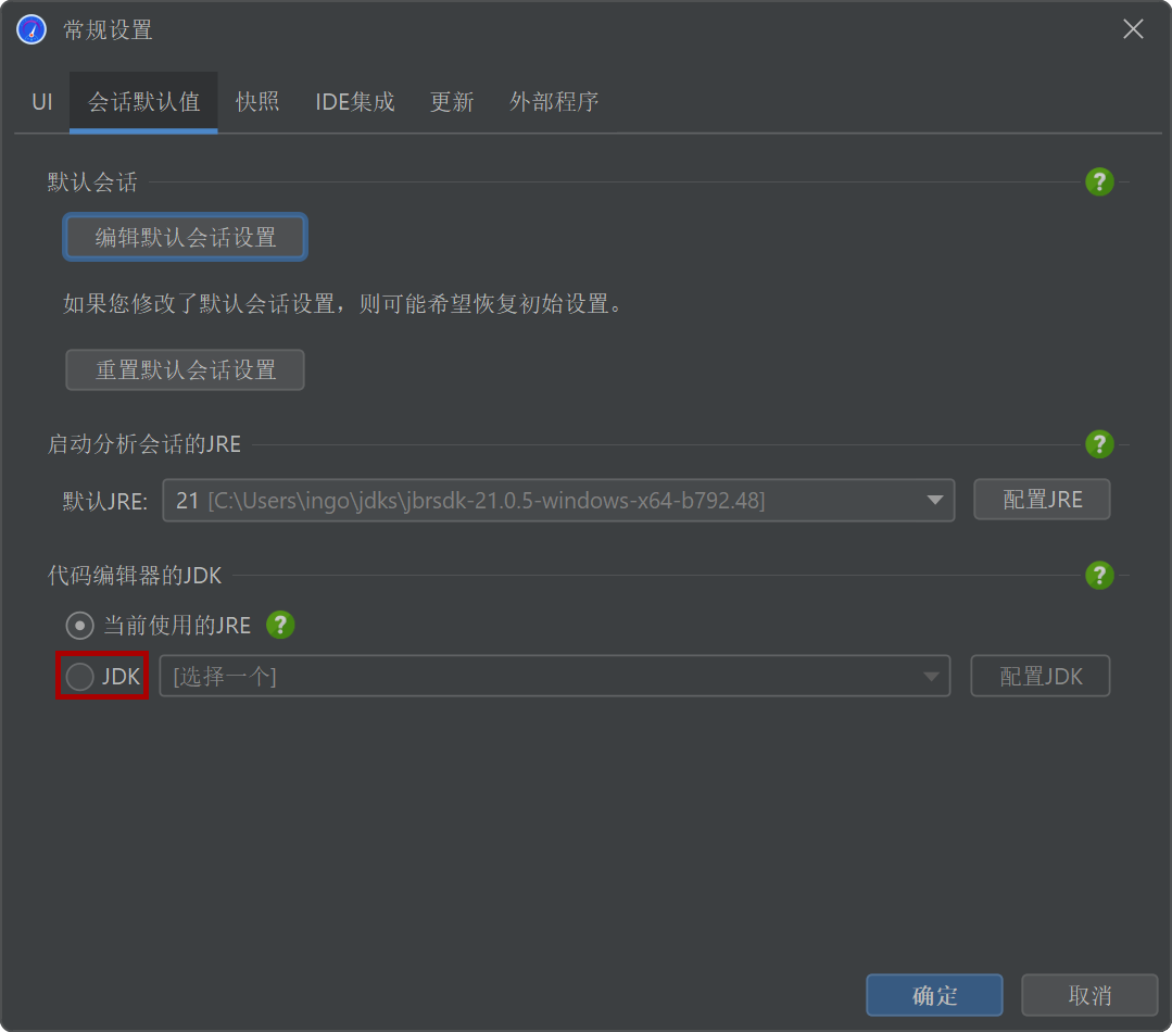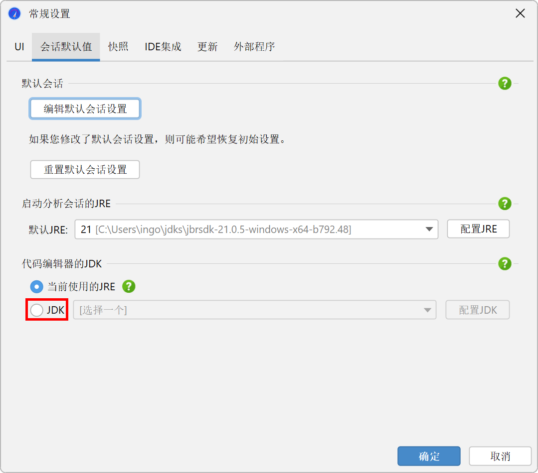 为了获得最完整的编辑器功能,建议在常规设置中配置一个JDK。默认情况下,使用JProfiler运行使用的JRE。 在这种情况下,代码补全不提供参数名和JRE中类的Javadoc。