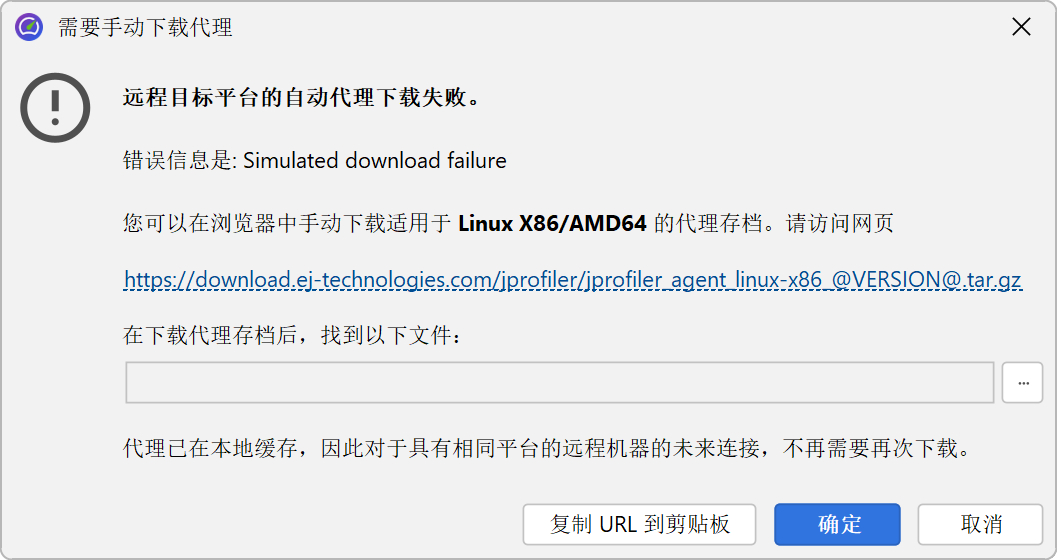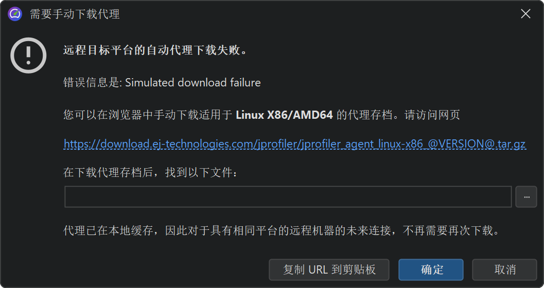 当发生代理下载错误时,JProfiler提供了手动解决方案。会弹出一个对话框,显示如何从官网手动下载代理压缩包,并在继续远程attach操作前定位已下载的压缩包。