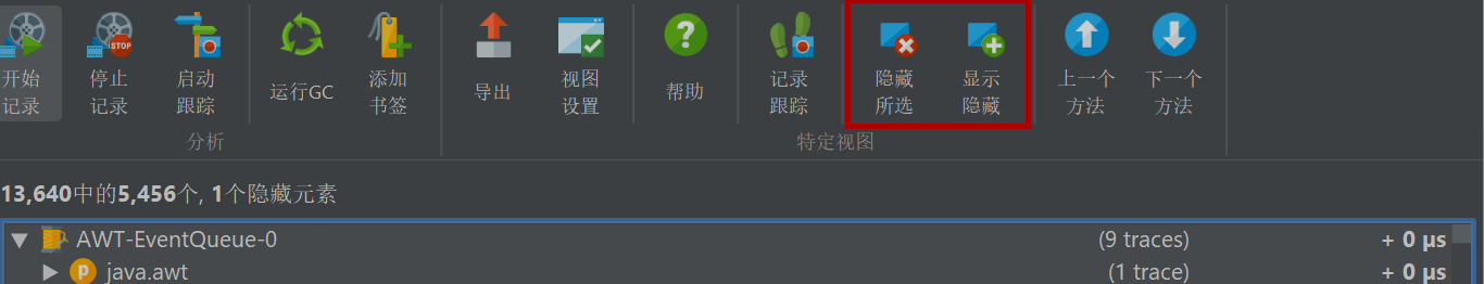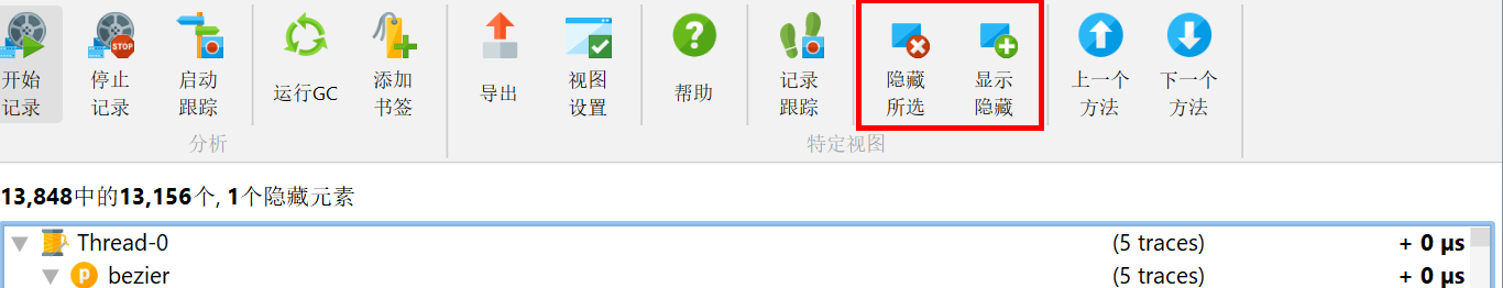 您可以通过选择节点并按删除 (delete)键来隐藏节点。所选节点的所有其他实例和所有关联的子节点也将被隐藏。在视图顶部,您可以看到所有记录的跟踪中仍显示了多少调用跟踪。要再次显示隐藏的节点,您可以单击显示隐藏