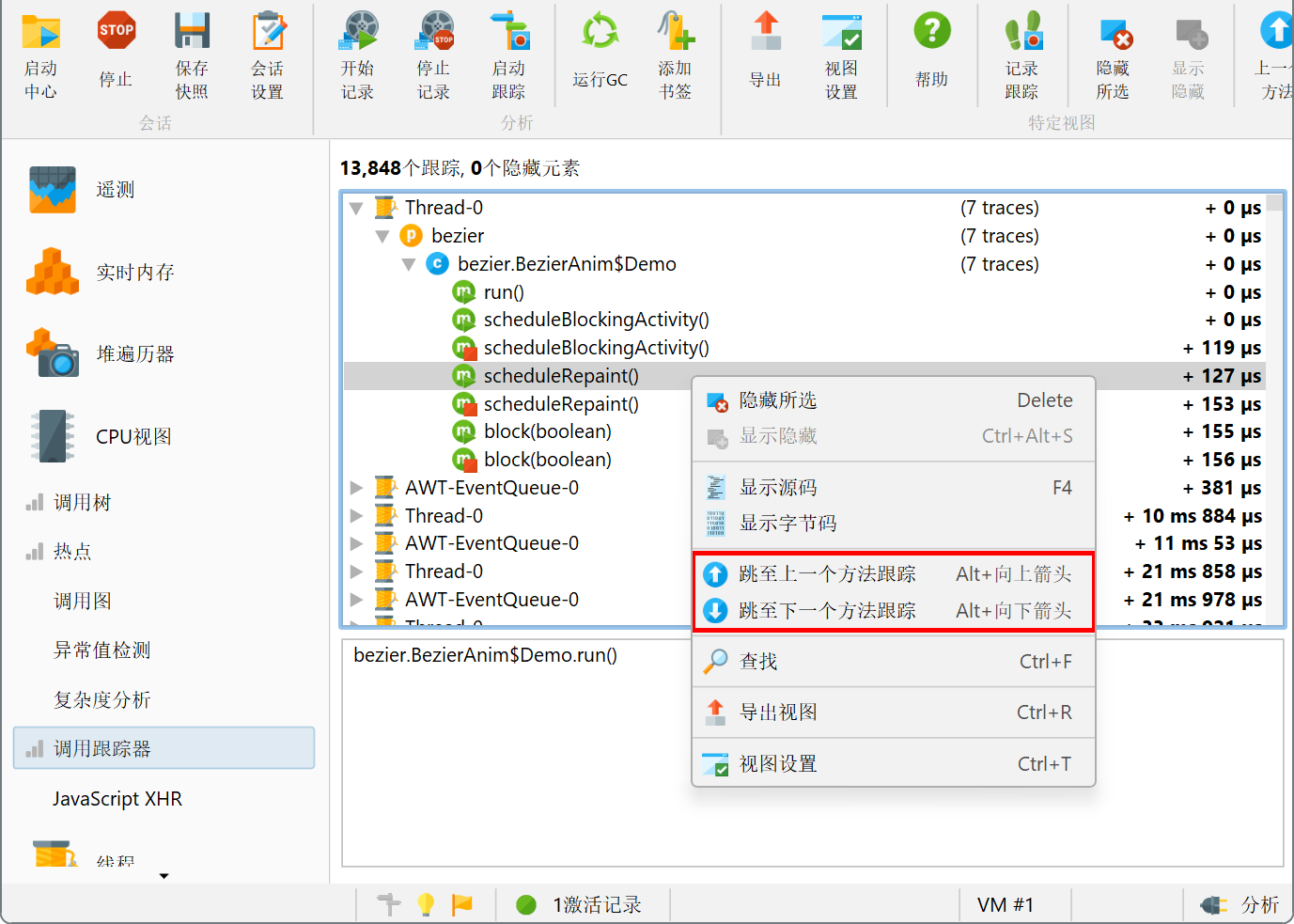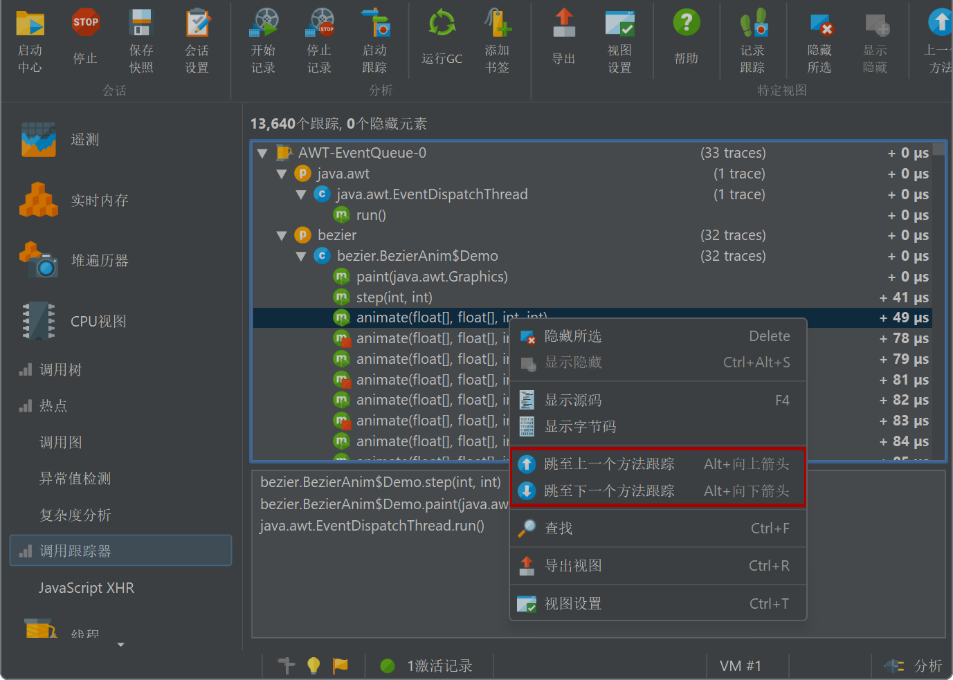 方法退出 (method exit)节点。在调用跟踪的表格下方,显示当前选定的方法跟踪的堆栈跟踪。如果从当前方法记录了对其他方法的调用跟踪,或者如果另一个线程中断了当前方法,则该方法的入口和退出节点将不相邻。您只能通过使用上一个方法 (Previous Method)和下一个方法