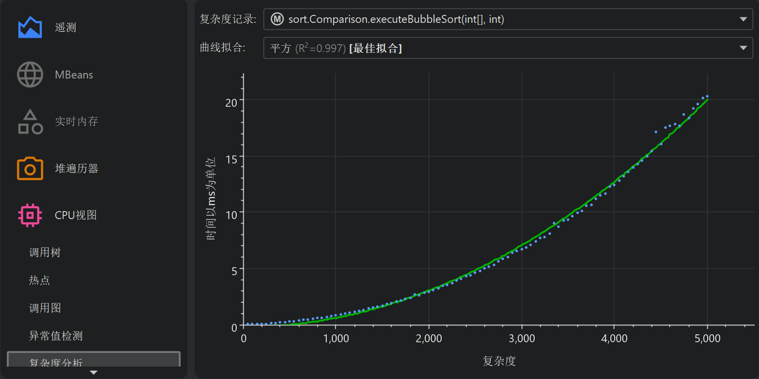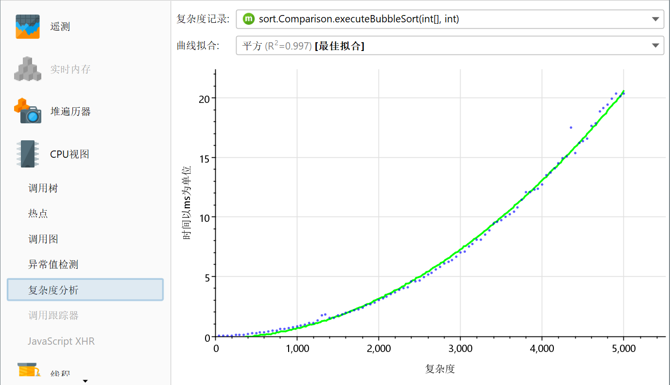 图形是一个气泡图,其中每个数据点的大小与其中的测量次数成比例。如果所有测量值都是不同的,您将看到一个常规的散点图。在另一个极端情况下,如果所有方法调用具有相同的复杂性和执行时间,您将看到一个大的圆圈。