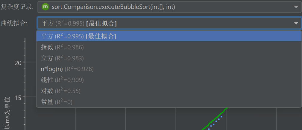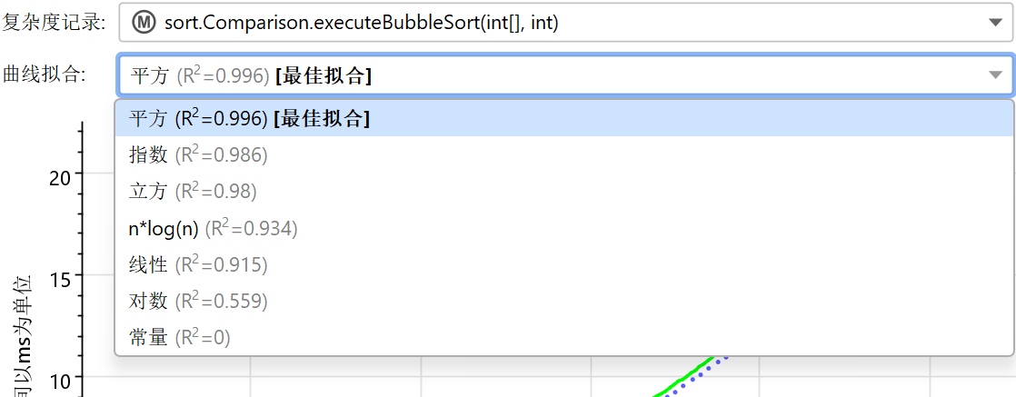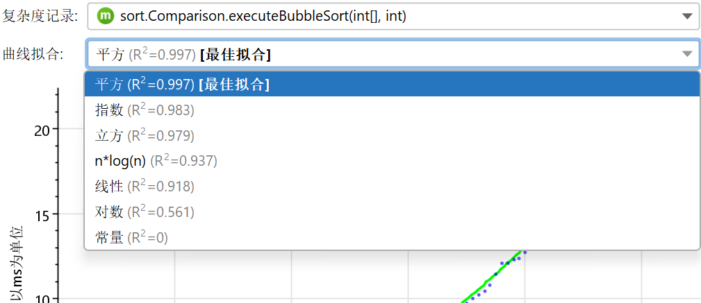 如果至少有3个数据点,将显示一个具有常见复杂性的曲线拟合。JProfiler尝试从几个常见复杂性中进行曲线拟合,并最初向您显示最佳拟合。曲线拟合的下拉菜单还允许您显示其他曲线拟合模型。嵌入在曲线拟合描述中的R2值显示了拟合的好坏。下拉菜单中的模型按R2降序排列,因此最佳模型始终是第一个项目。