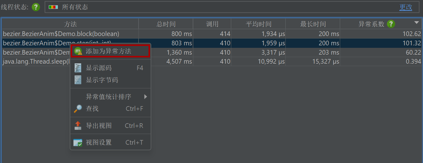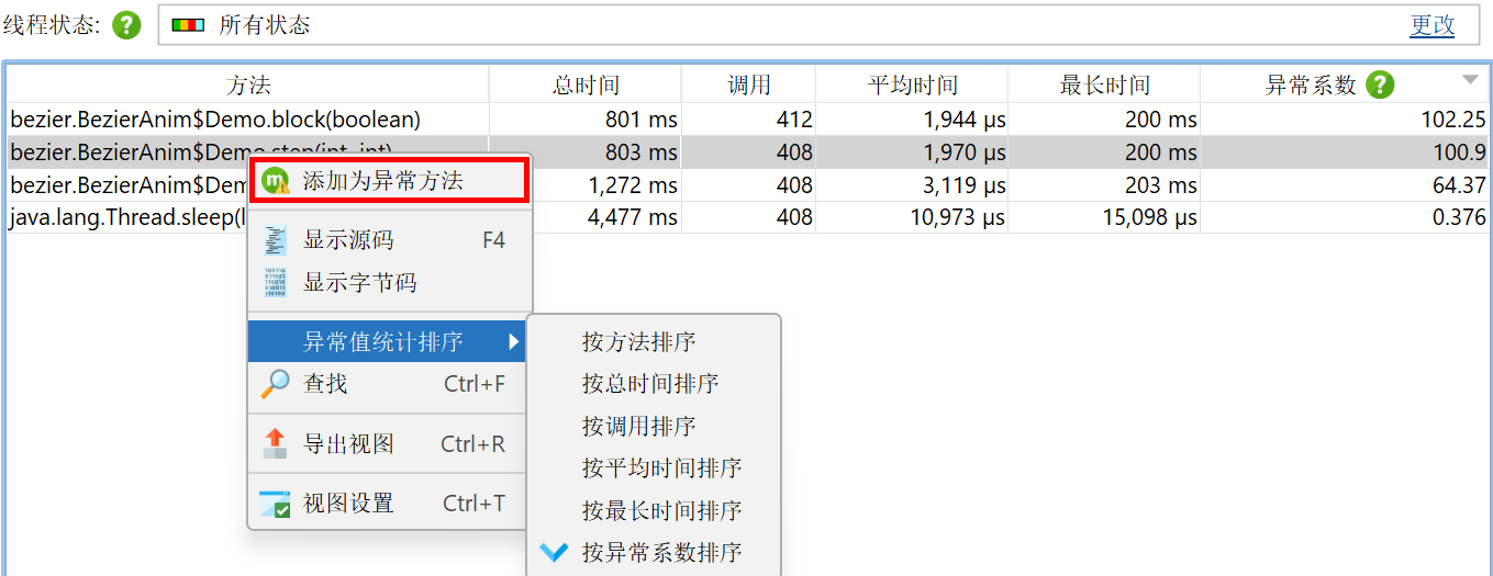 一旦您确定了一个存在异常调用持续时间的问题方法,您可以在上下文菜单中将其添加为异常方法。同样的上下文菜单操作也可以在调用树视图中使用。