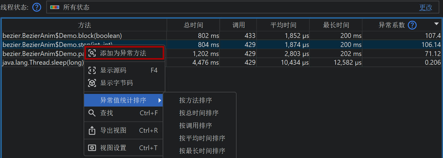 一旦你确定某个方法存在异常调用耗时,可以通过右键菜单将其添加为异常方法 (exceptional method)。同样的菜单操作也可以在调用树 (call tree) 视图 (view) 中使用。