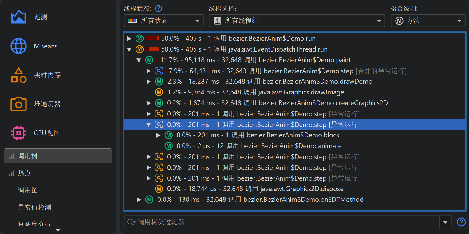 在某些情况下,问题并不是方法的平均调用时间过长,而是该方法偶尔会出现异常行为。在调用树 (call tree) 中,所有方法调用都会被累计,因此一个被频繁调用的方法即使每 10000 次调用中有一次耗时比预期多 100 倍,也不会在总耗时中留下明显的痕迹。
