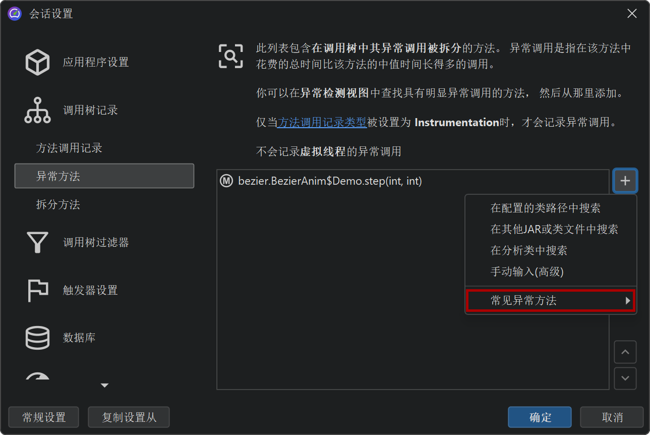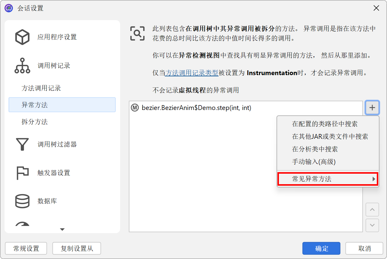 在会话 (session) 设置中,你可以移除异常方法 (exceptional methods) 或添加新的异常方法,无需依赖调用树 (call tree) 或异常值 (outlier) 检测视图 (view)。此外,异常方法 (exceptional method) 配置还提供了为常见系统(如 AWT 和 JavaFX 事件分发机制)添加异常方法定义的选项,这些系统中异常耗时的事件往往是主要问题。