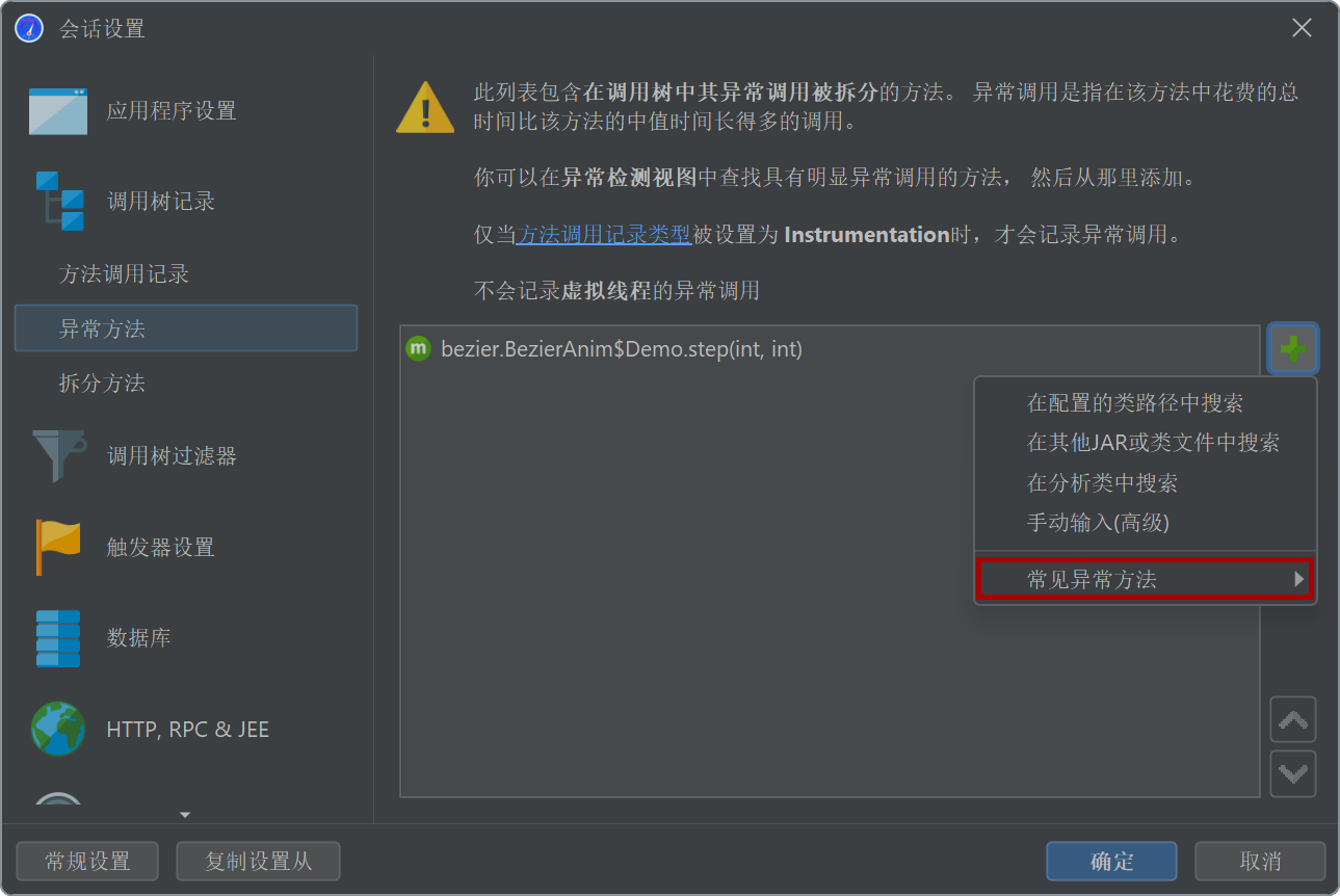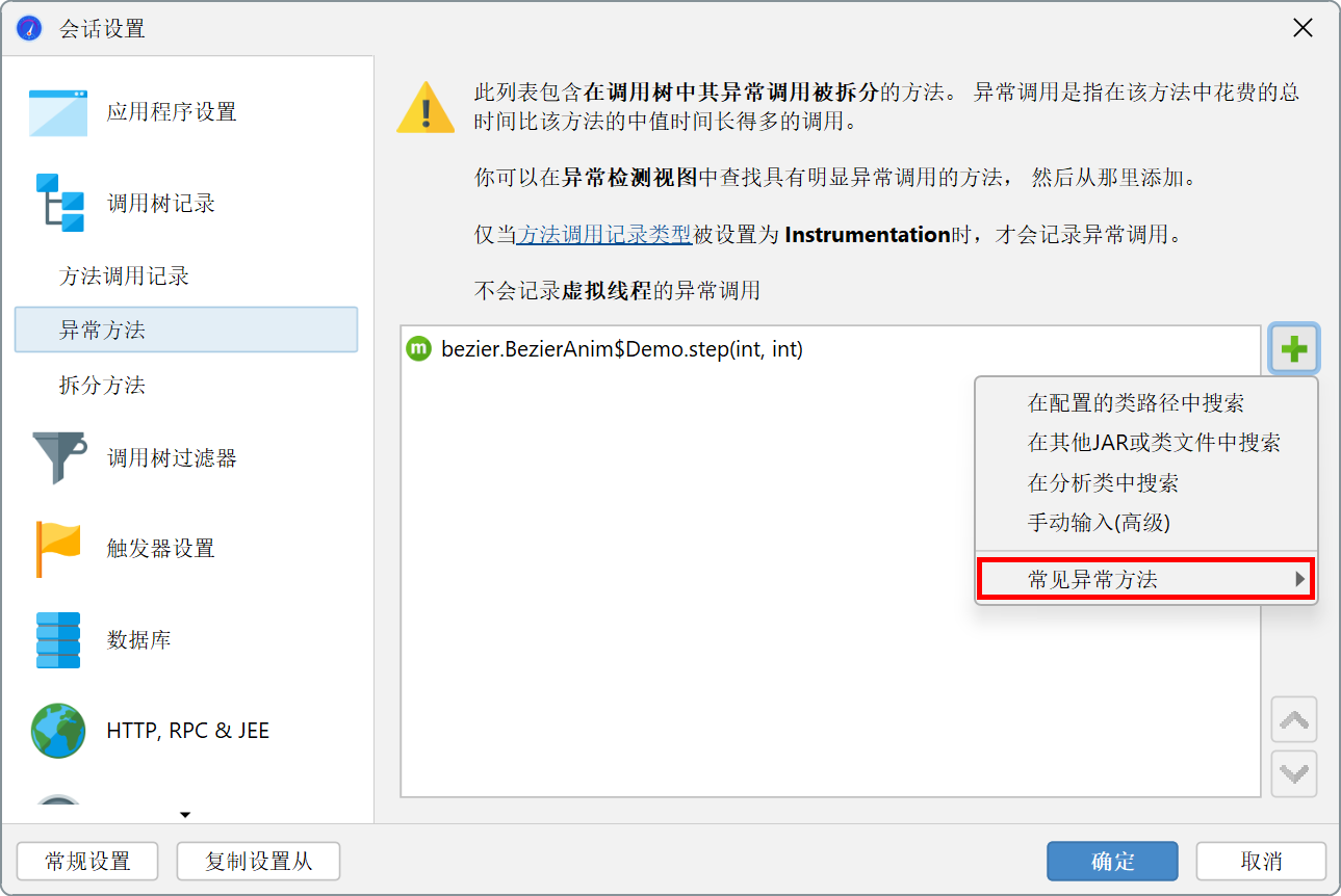 在会话设置中,您可以在没有调用树或异常值检测视图上下文的情况下删除异常方法或添加新方法。此外,异常方法配置提供了为知名系统添加异常方法定义的选项,例如AWT和JavaFX事件调度机制,其中异常长时间运行的事件是一个主要问题。