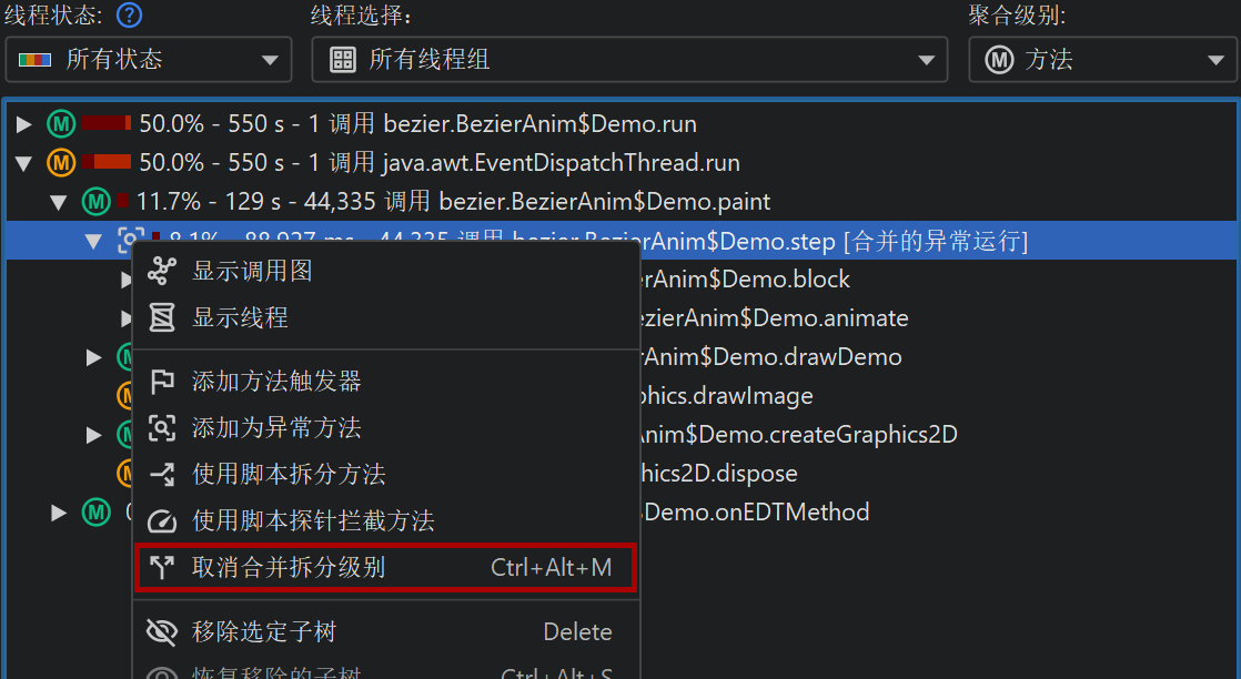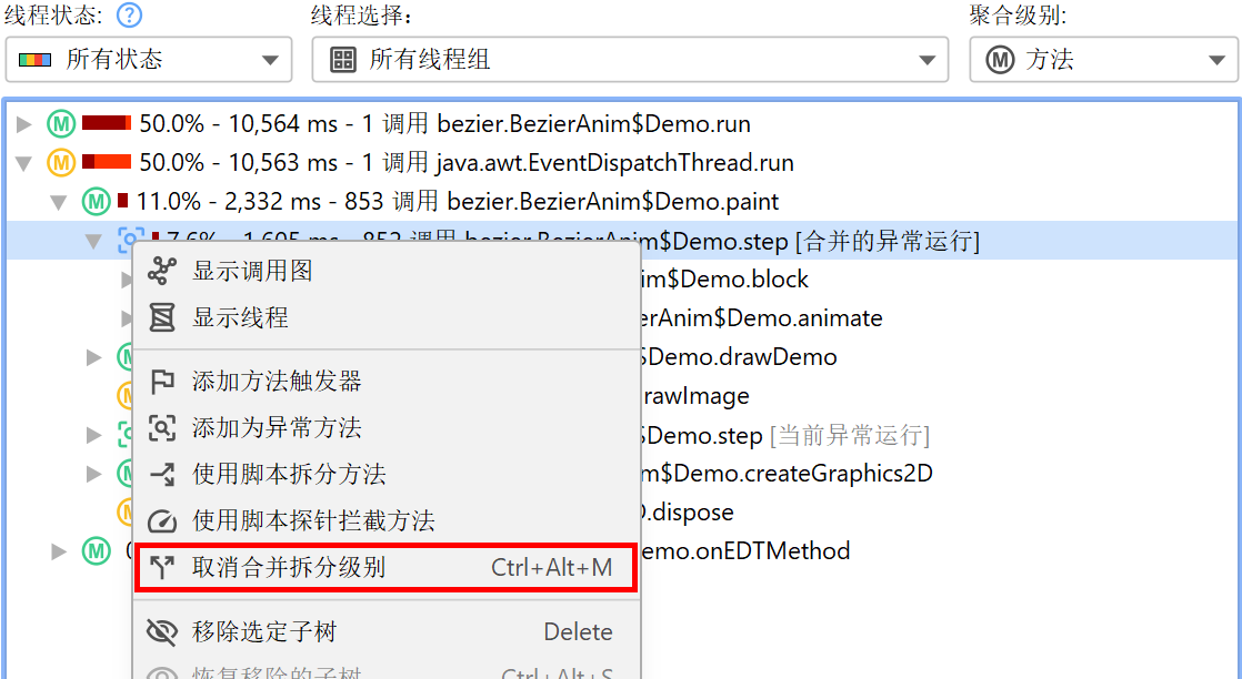 与通过探针 (probe)和拆分方法 (split methods)进行调用树 (call tree) 拆分类似,异常方法 (exceptional method) 节点 (node) 在右键菜单中有一个合并拆分级别 (Merge Splitting Level)操作,可让你随时合并或取消合并所有调用。