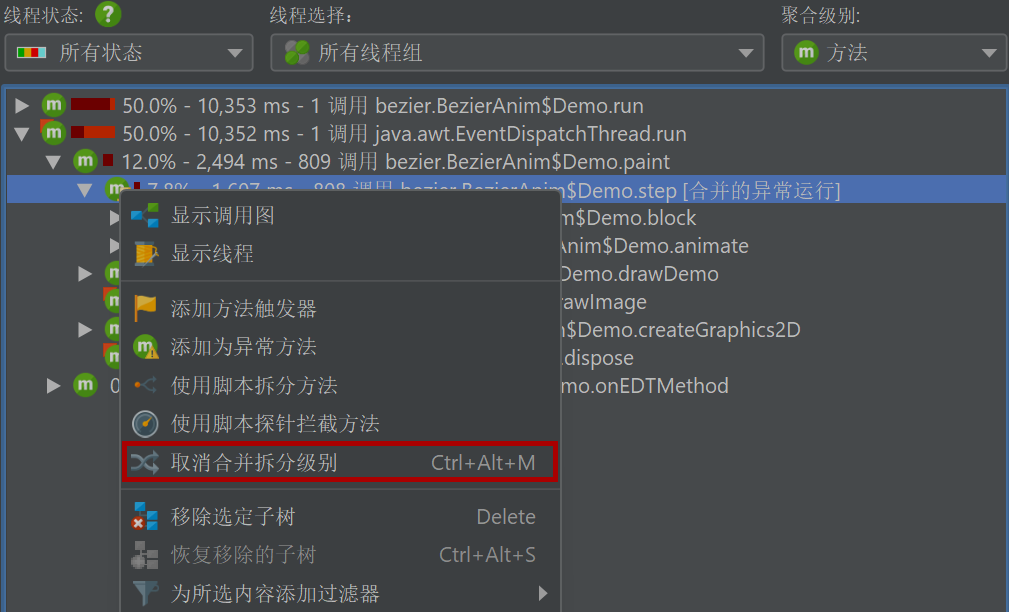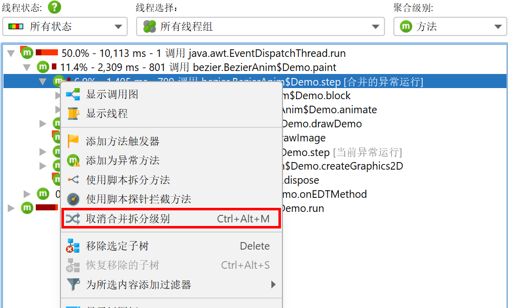 与通过探针和拆分方法进行的调用树拆分一样,异常方法节点在上下文菜单中有一个合并拆分级别操作,允许您动态合并和取消合并所有调用。