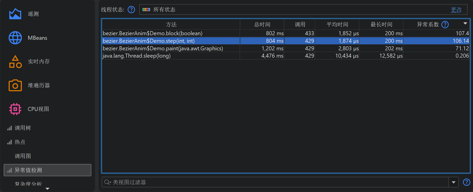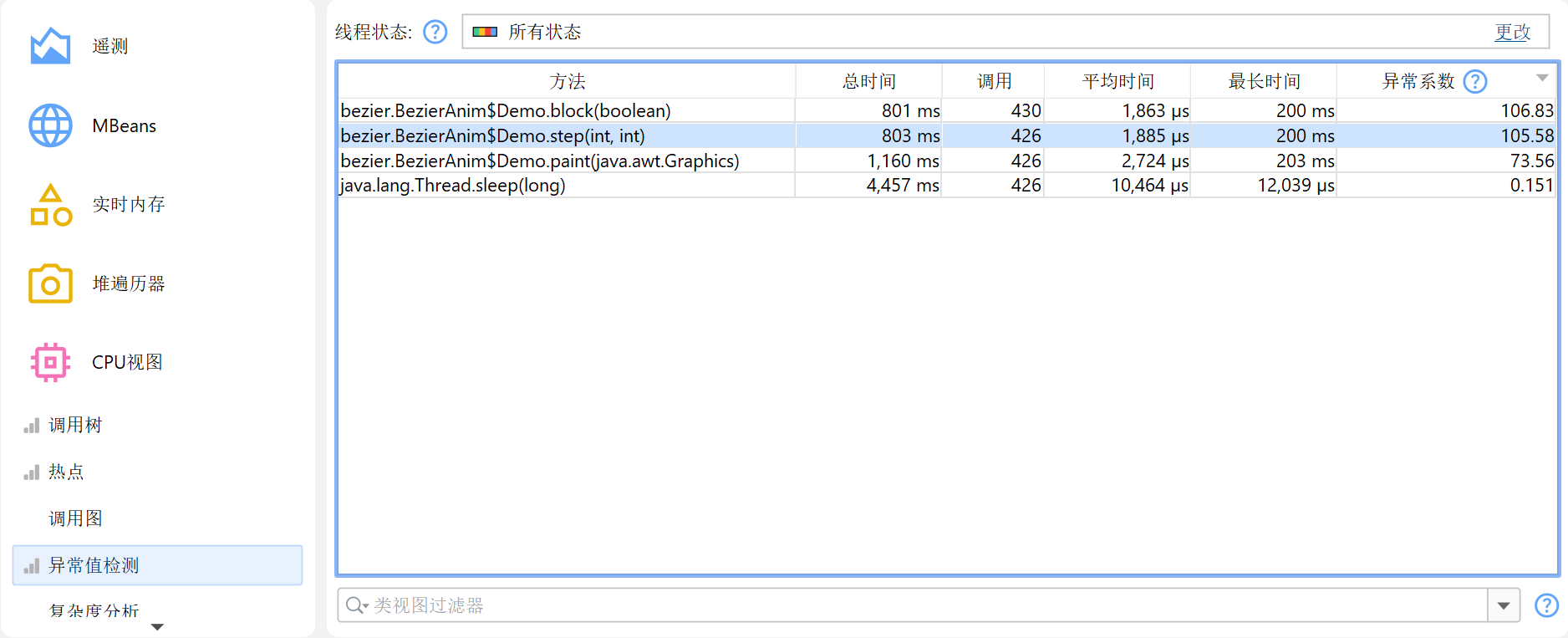 在区分慢方法调用时,必须选择某种线程状态用于耗时测量。这不能依赖 CPU 视图 (view) 中的线程状态选择,因为那只是显示选项而不是记录选项。默认情况下,使用 wall clock 时间,但也可以在配置文件设置 (profiling setting) 中配置不同的线程状态。异常值 (outlier) 检测视图 (view) 也会使用相同的线程状态。