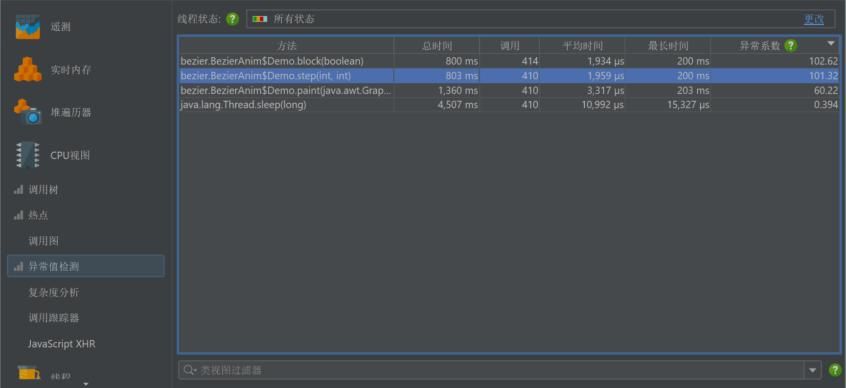 为了避免来自仅调用几次的方法和运行时间极短的方法的过多混乱,可以在视图设置中设置最大时间和调用次数的下限。默认情况下,异常值统计中仅显示最大时间超过10毫秒且调用次数大于10的方法。
