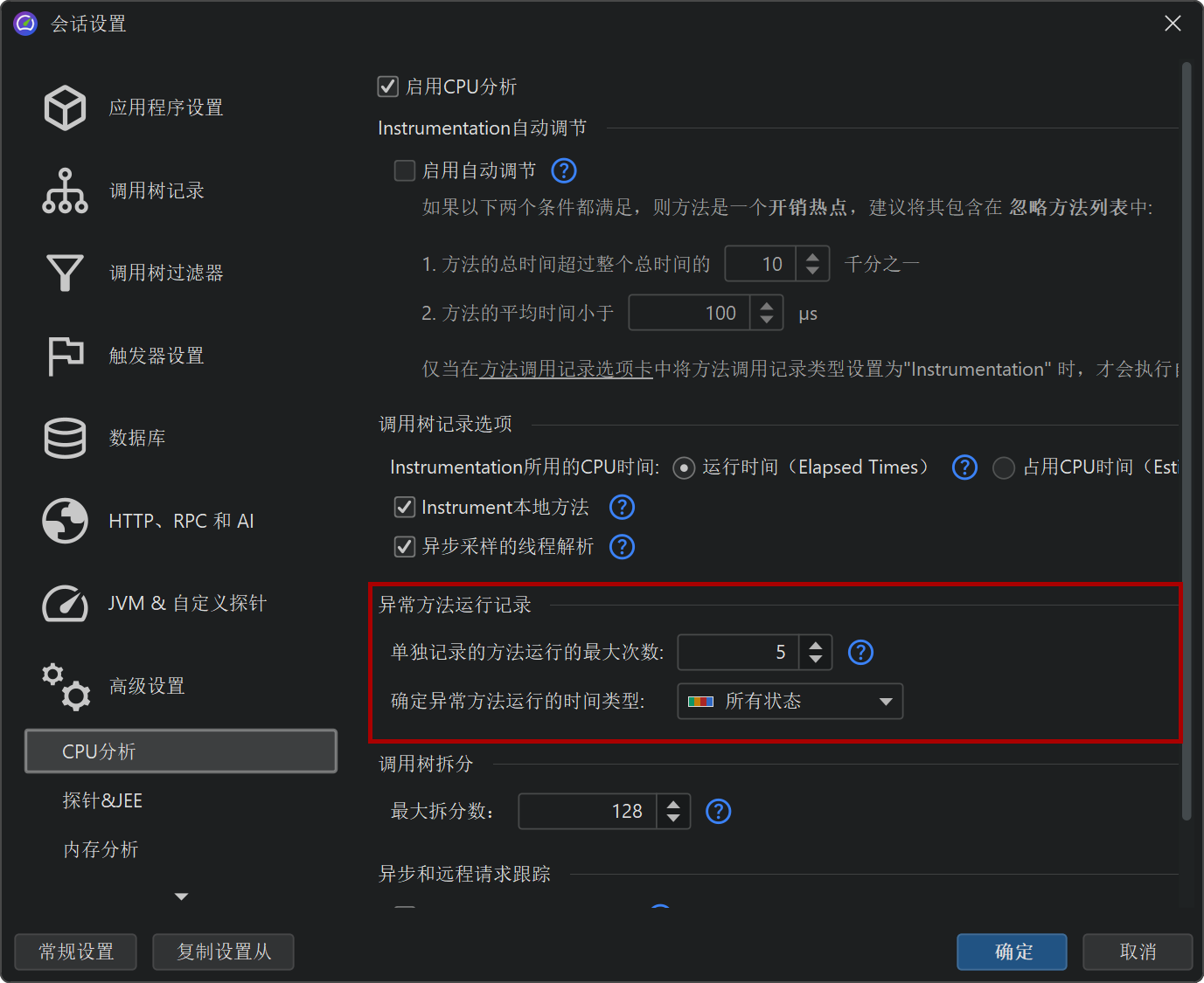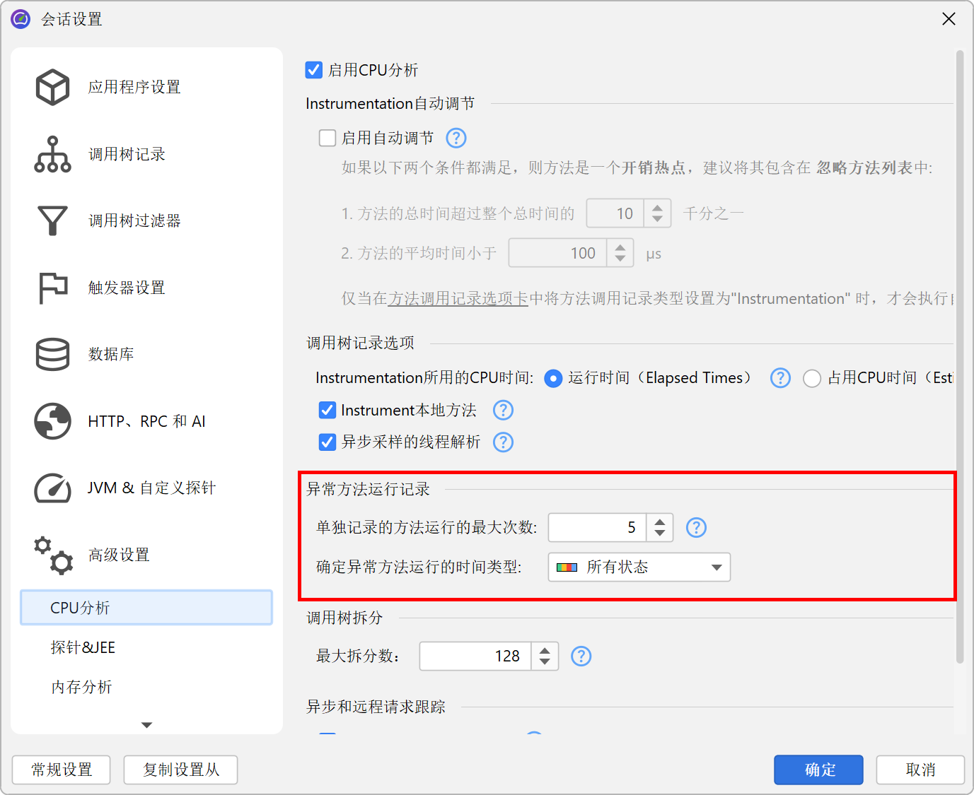 当你为异常方法 (exceptional method) 启用记录后,调用树 (call tree) 会单独保留部分最慢的调用,其余调用则像往常一样合并为一个方法节点 (node)。单独保留的调用次数可以在配置文件设置 (profiling setting) 中进行配置,默认值为 5。