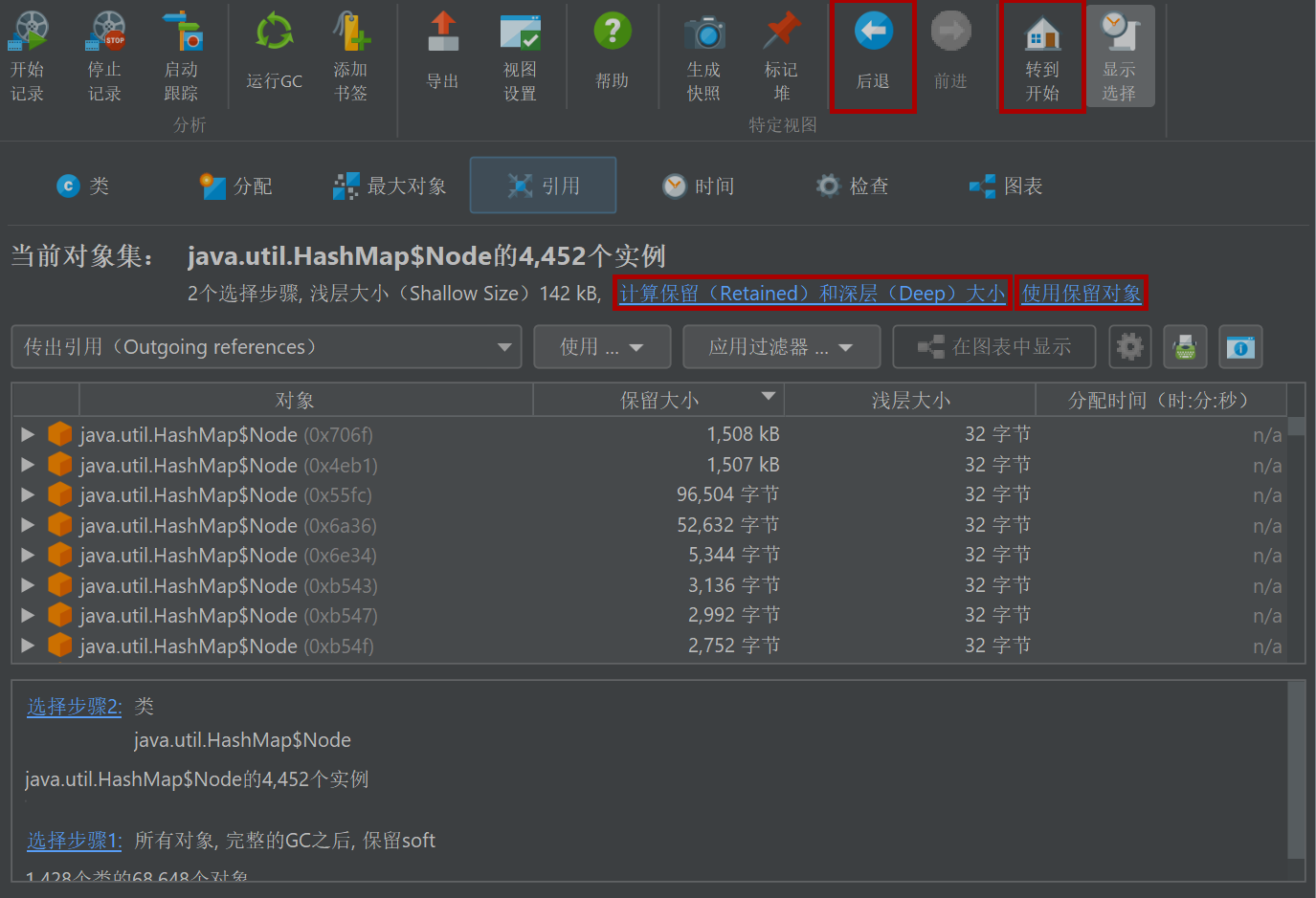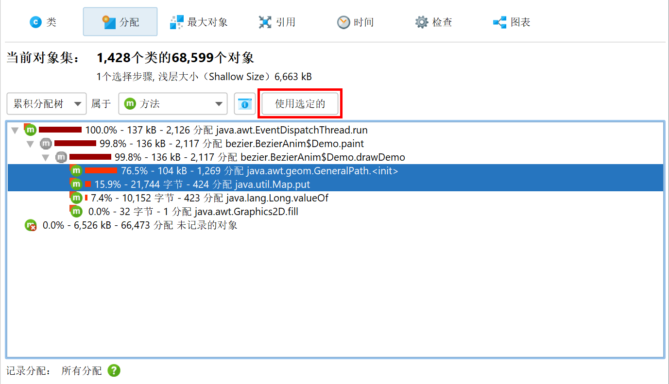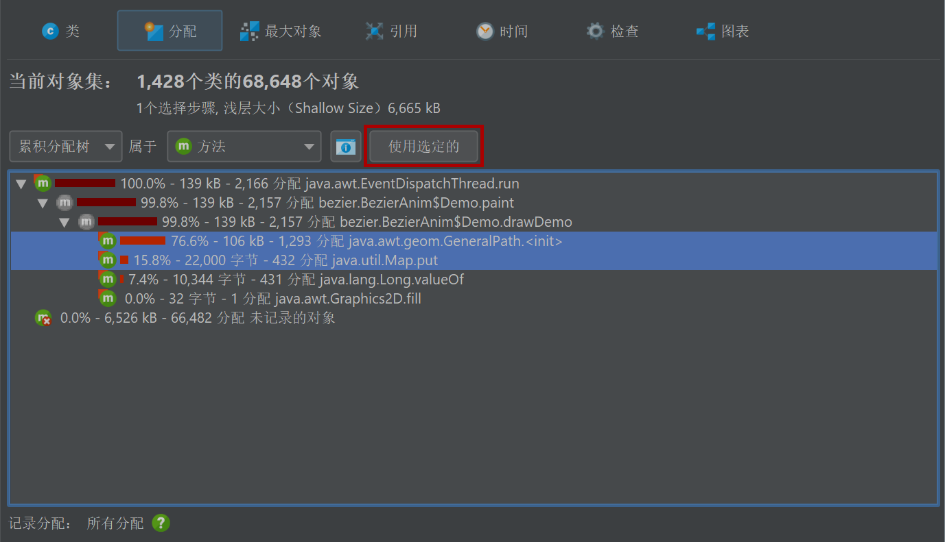 与类视图一样,您可以选择多个节点,并使用顶部的Use Selected按钮创建新的选择步骤。在“Allocation hot spots”视图模式中,您还可以选择回溯中的节点。这将仅选择在关联的顶级热点上分配的对象,这些对象的调用栈以所选回溯结束。