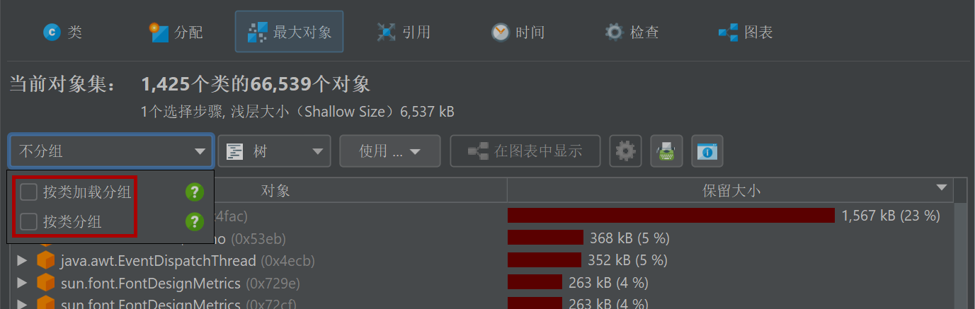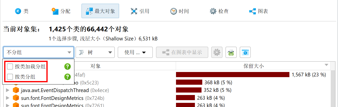 除了显示单个对象,支配树还可以将最大对象分组到类中。视图顶部的分组下拉菜单包含一个复选框,用于激活此显示模式。此外,您可以在顶级添加类加载器分组。类加载器分组在计算最大对象后应用,并显示谁加载了最大对象的类。如果您想分析特定类加载器的最大对象,可以先使用“Group by class loader”检查。