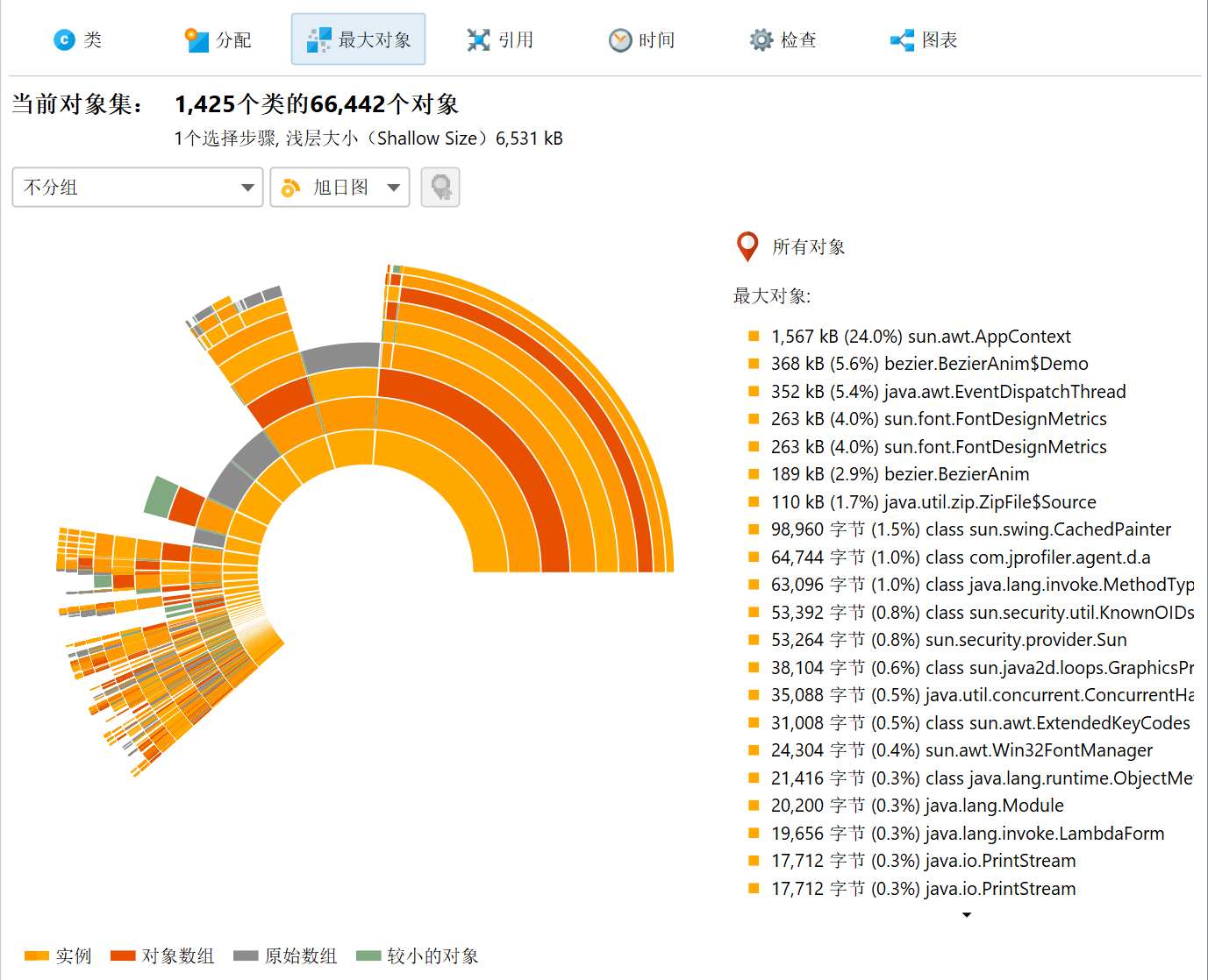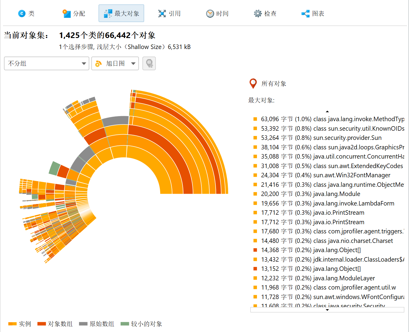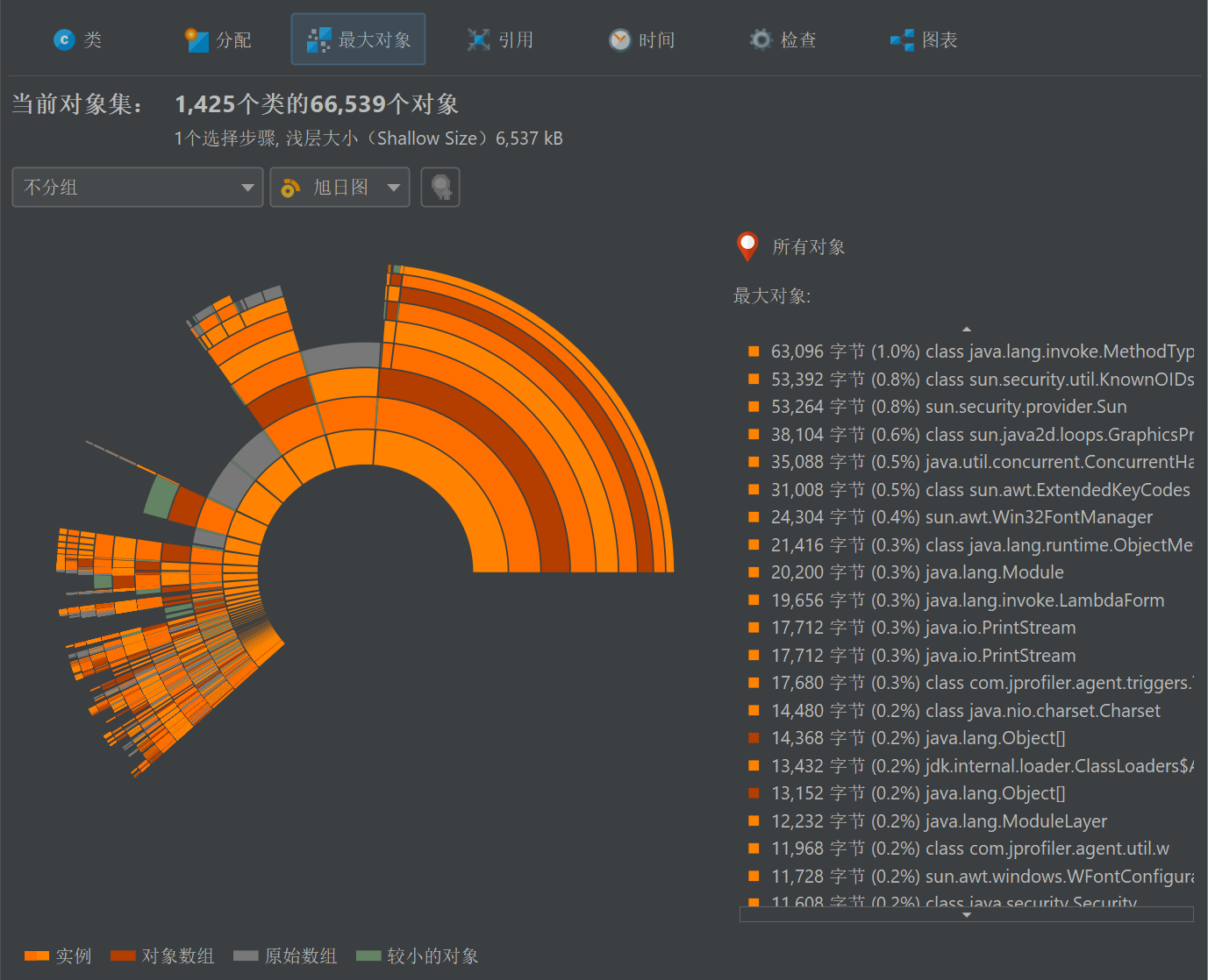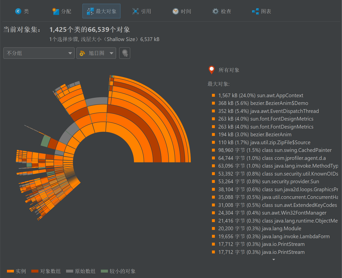 最大对象视图上方的视图模式选择器允许您切换到旭日图。该图由一系列同心分段环组成,显示支配树的整个内容,最多深度为一个图像。引用起源于最内层的环,并向圆的外缘传播。此可视化为您提供了一个扁平化的视角,具有高信息密度,使您能够发现引用模式,并通过其特殊的颜色编码一目了然地看到大型原始和对象数组。