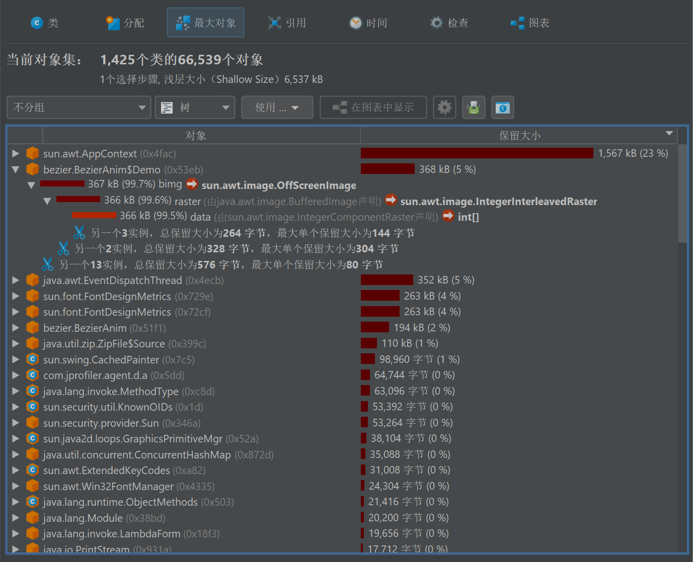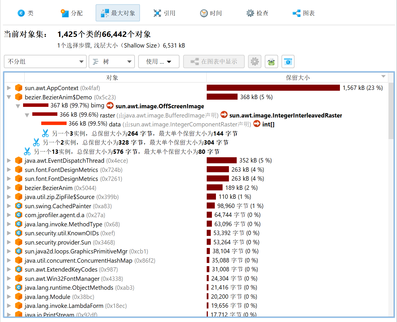 最大对象视图显示当前对象集中最重要对象的列表。在此上下文中,“最大”意味着如果从堆中删除这些对象,将释放最多内存的对象。该大小称为retained size。相反,deep size是通过强引用可达的所有对象的总大小。