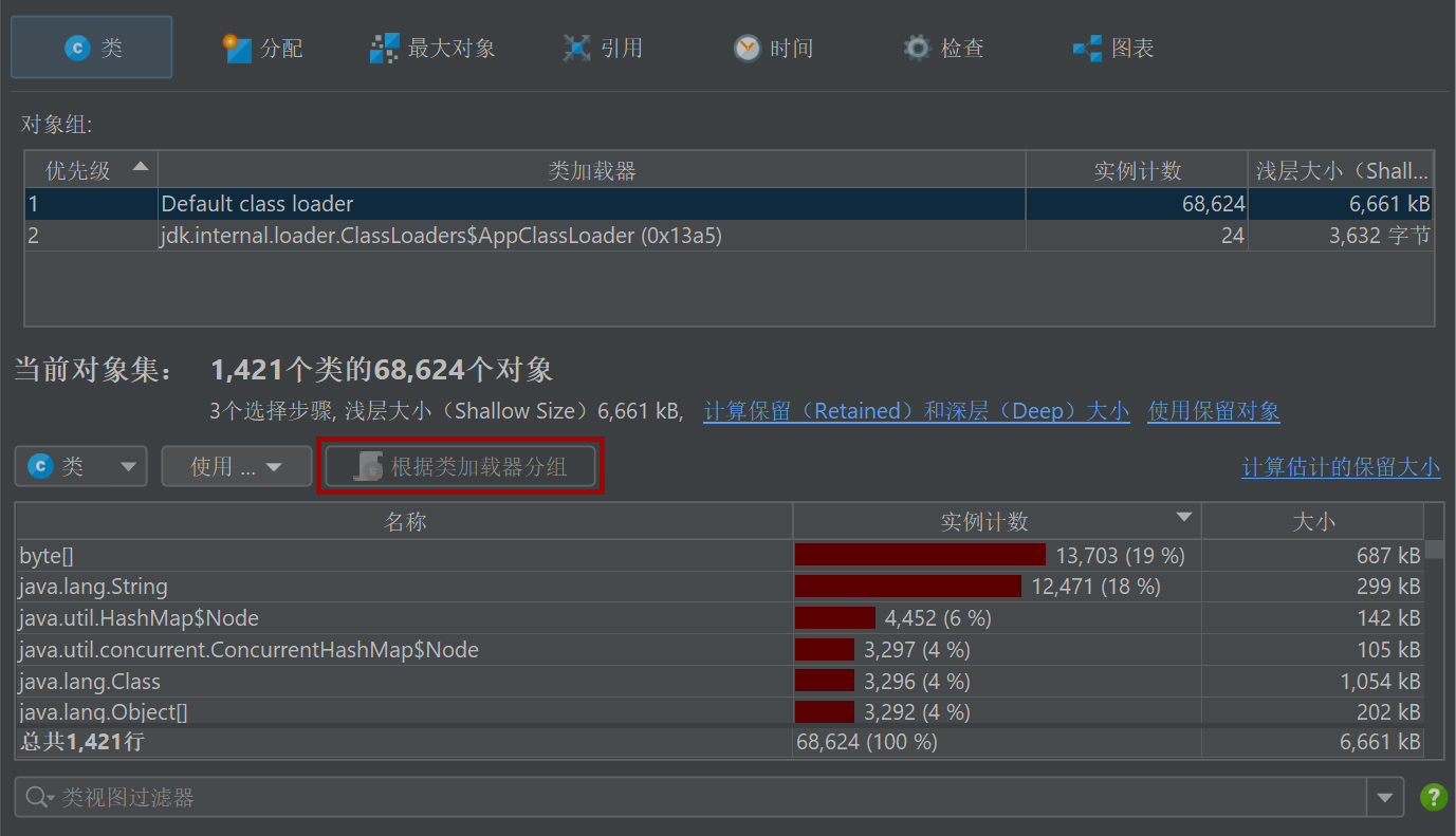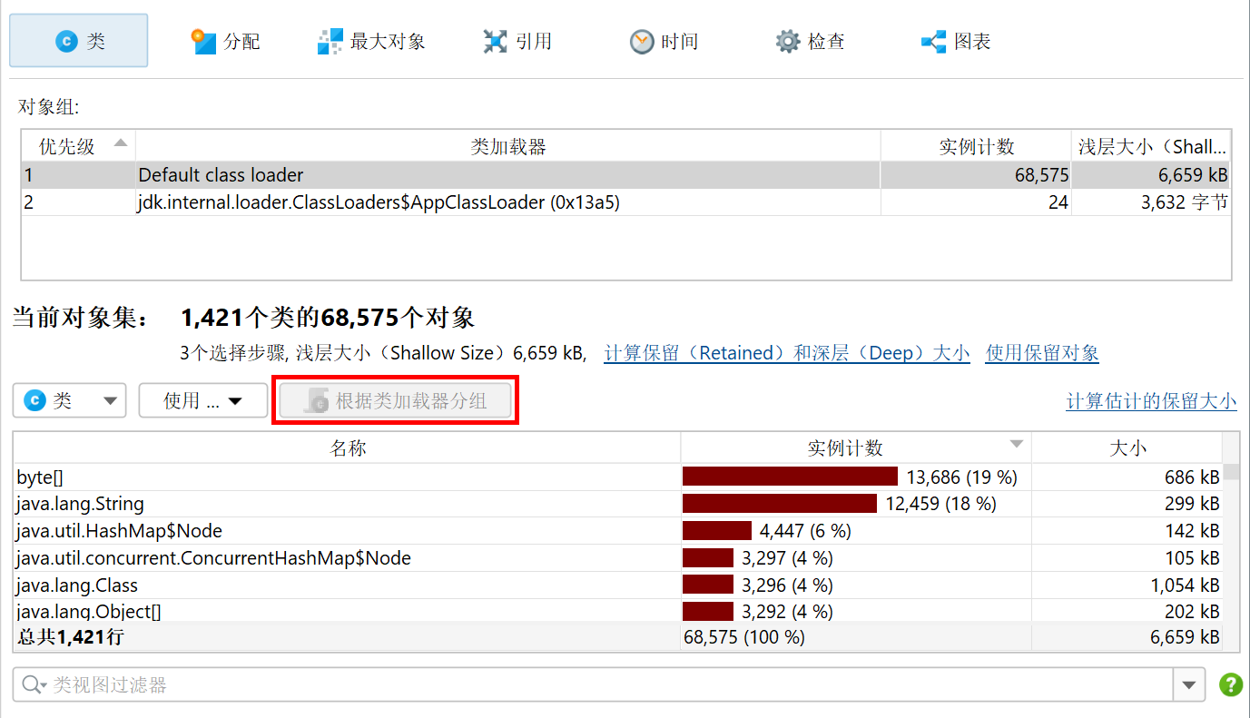 在解决类加载器相关问题时,您通常需要按类加载器对实例进行分组。Inspections选项卡提供了一个“Group by class loaders”检查,该检查在类视图中可用,因为在该上下文中特别重要。如果您执行该分析,顶部的分组表将显示所有类加载器。选择一个类加载器会相应地过滤下面视图中的数据。当您切换到堆遍历器的其他视图时,分组表仍然存在,直到您执行另一个选择步骤。然后,类加载器选择成为该选择步骤的一部分。