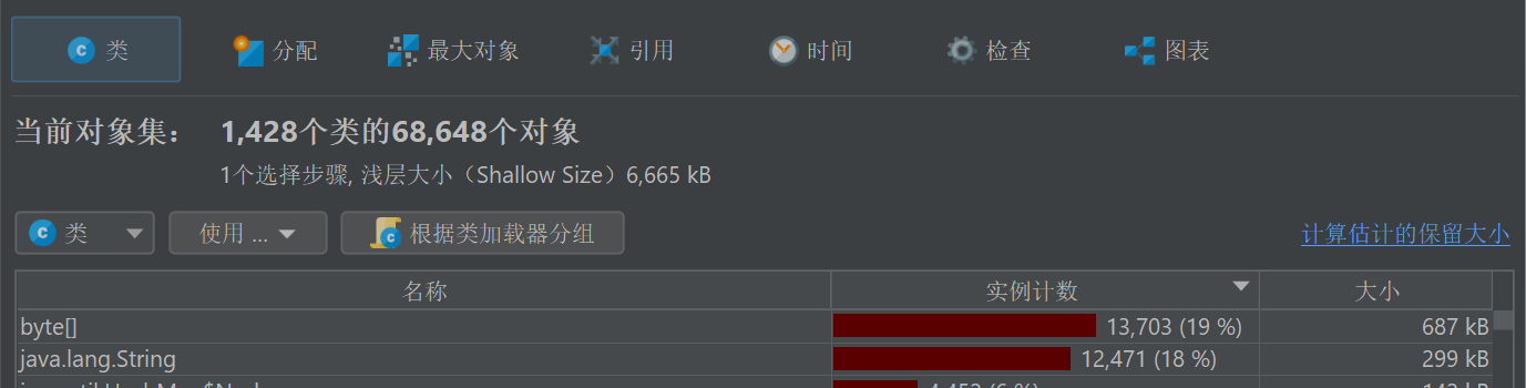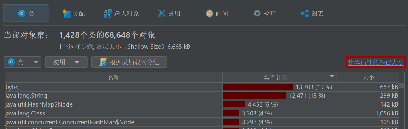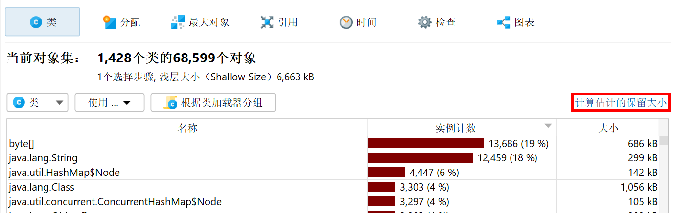 类视图类似于live memory section中的“All objects”视图,并具有可以将类分组到包中的聚合级别选择器。此外,它可以显示类的估计保留大小。这是如果从堆中删除一个类的所有实例,将释放的内存量。如果单击Calculate estimated retained sizes超链接,将添加一个新的Retained Size列。显示的保留大小是估计的下限,计算确切的数字会太慢。如果您确实需要确切的数字,请选择感兴趣的类或包,并使用新对象集标题中的Calculate retained and deep sizes超链接。
