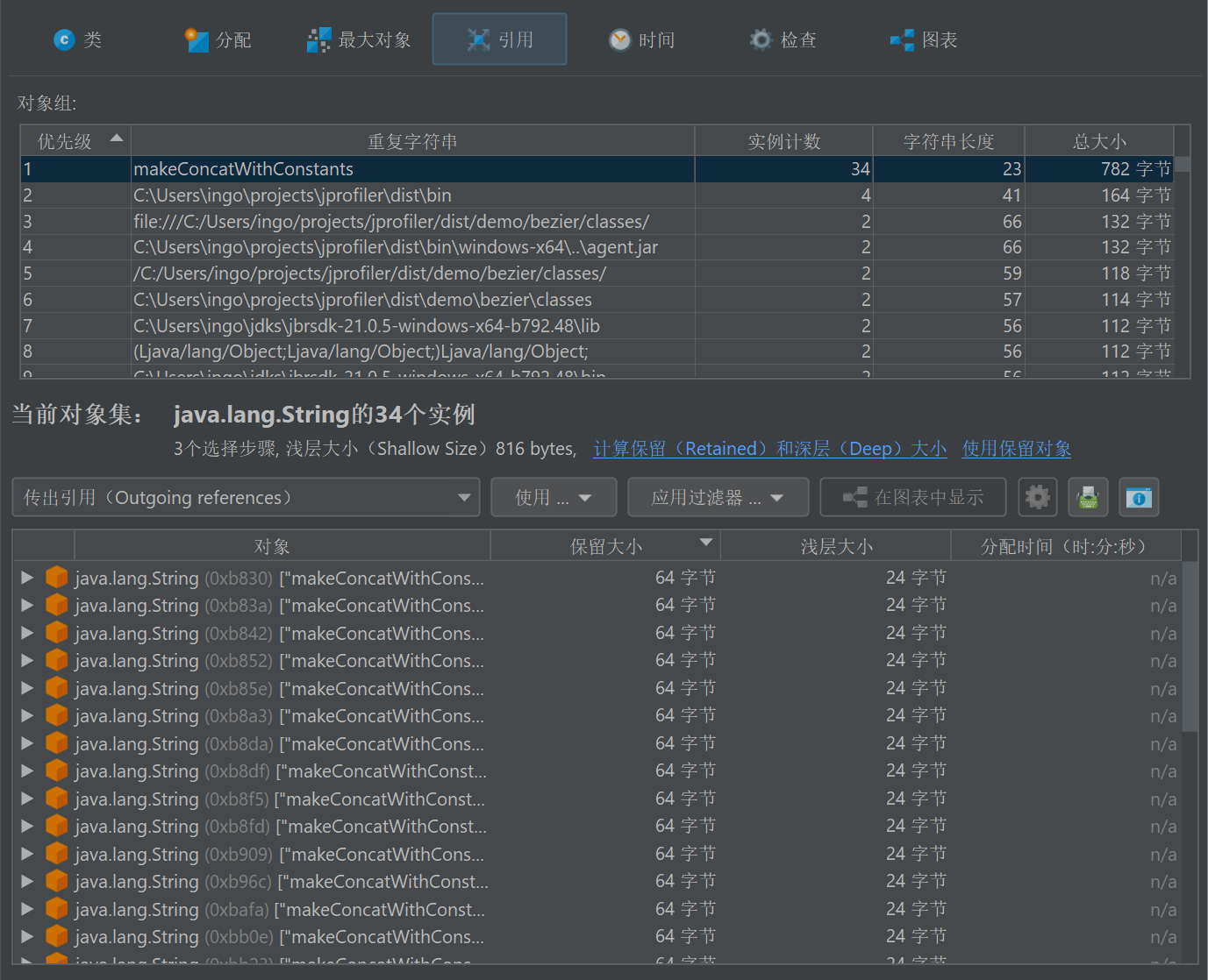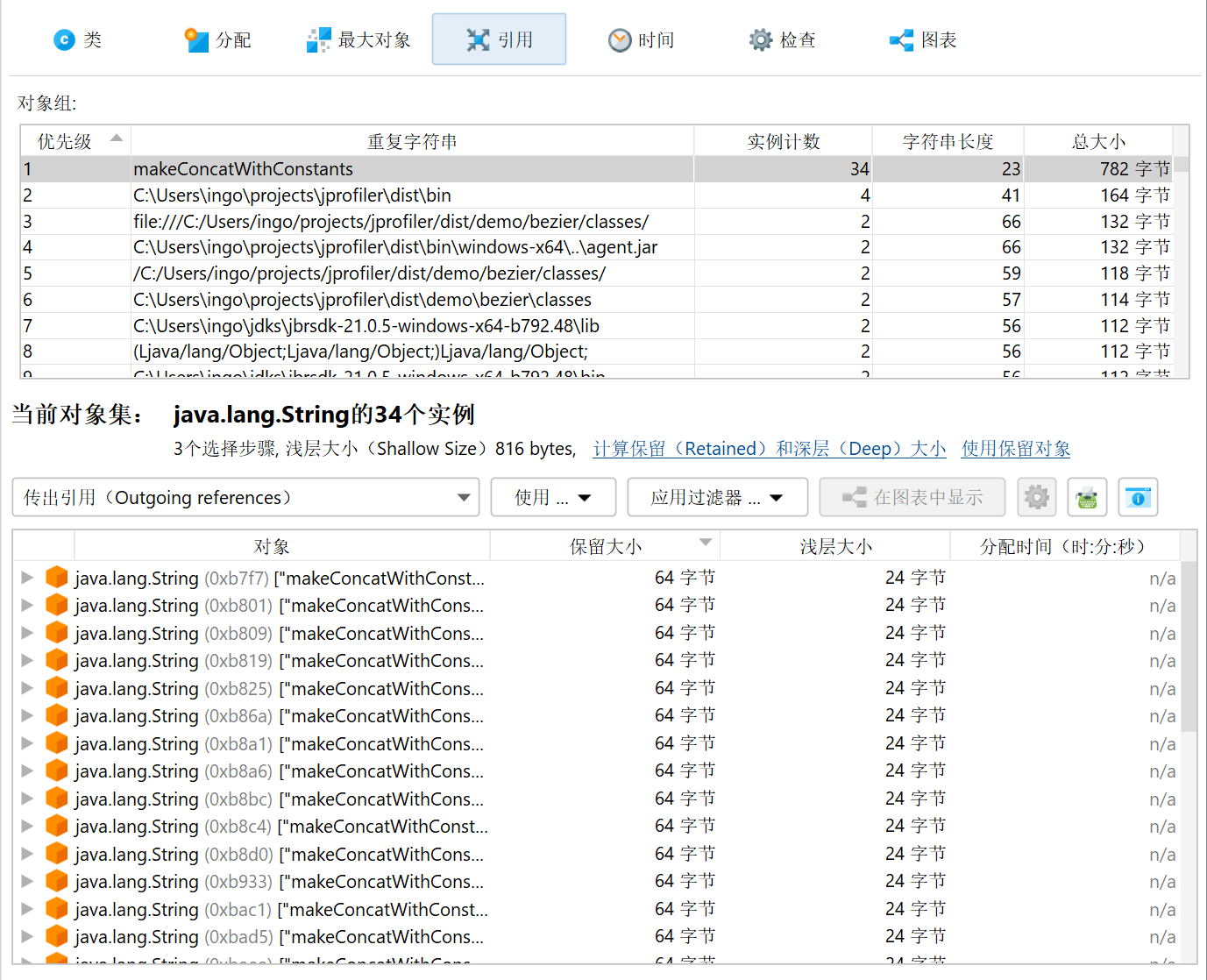 strings”检查将重复的字符串值显示为组。如果您在引用视图中,您可以看到具有选定字符串值的java.lang.String实例。最初,组表中的第一行被选中。通过更改选择,您更改了当前对象集。组表的Instance