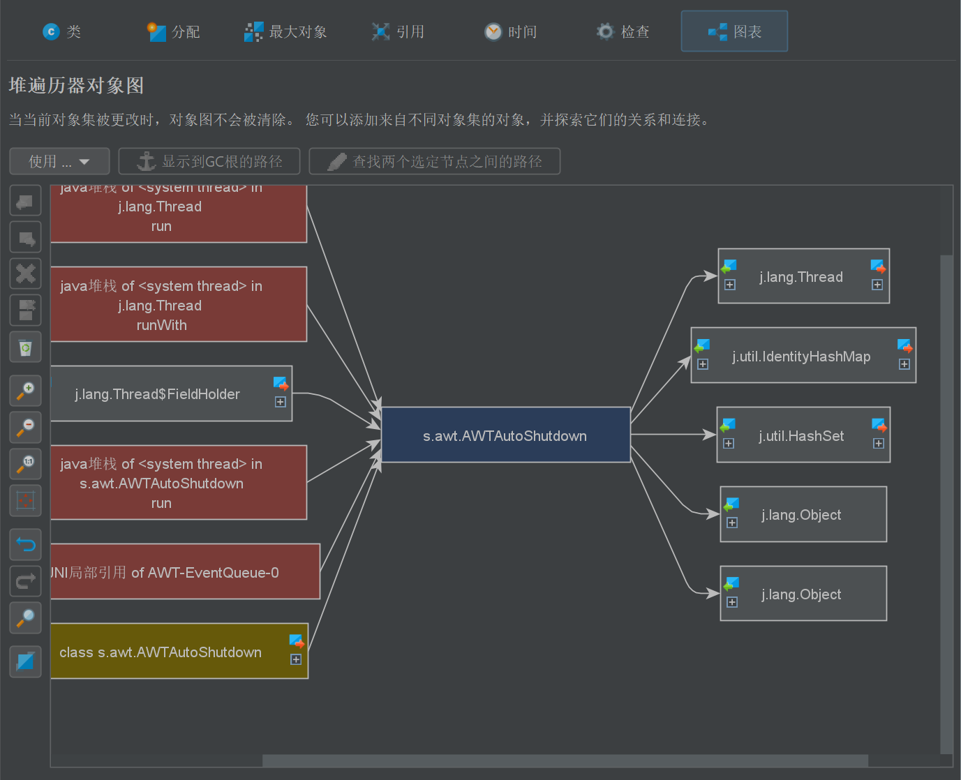 与传入引用视图一样,图形具有Show Path To GC Root按钮,如果可用,将扩展到垃圾收集器根的一个或多个引用链。此外,还有一个Find Path Between Two Selected Nodes操作,如果选择了两个实例,则处于活动状态。它可以搜索有向和无向路径,并可选地沿着弱引用。如果找到合适的路径,将以红色显示。
