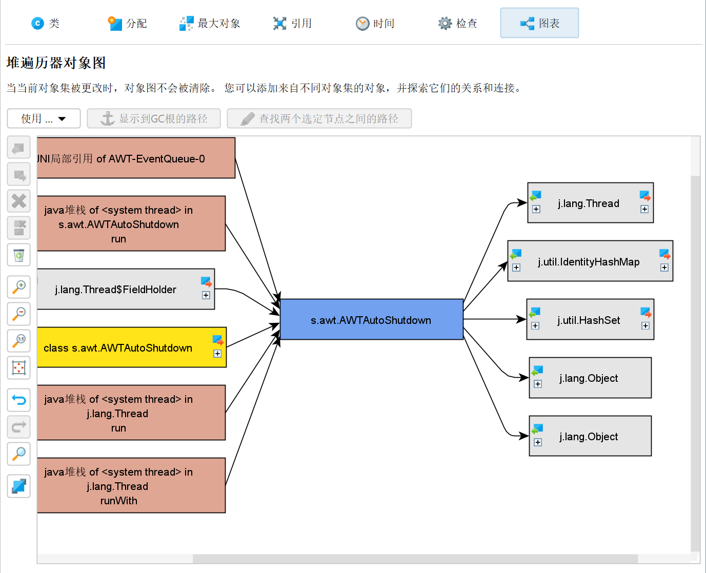 堆遍历器图形不会自动显示当前对象集中的任何对象,也不会在您更改当前对象集时清除。您可以从传出引用视图、传入引用视图或最大对象视图中手动将选定对象添加到图形中,方法是选择一个或多个实例并使用Show In Graph操作。