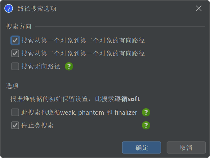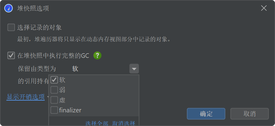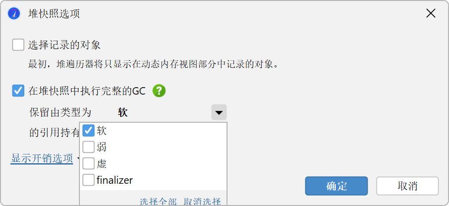 此外,堆遍历器会执行垃圾收集并删除弱引用对象,软引用除外。这通常是可取的,因为在寻找内存泄漏时,弱引用对象会分散注意力,而只有强引用对象才相关。然而,在那些您对弱引用对象感兴趣的情况下,您可以告诉堆遍历器保留它们。JVM中的四种弱引用类型是“soft”、“weak”、“phantom”和“finalizer”,您可以选择其中哪种类型应该足以在堆快照中保留对象。