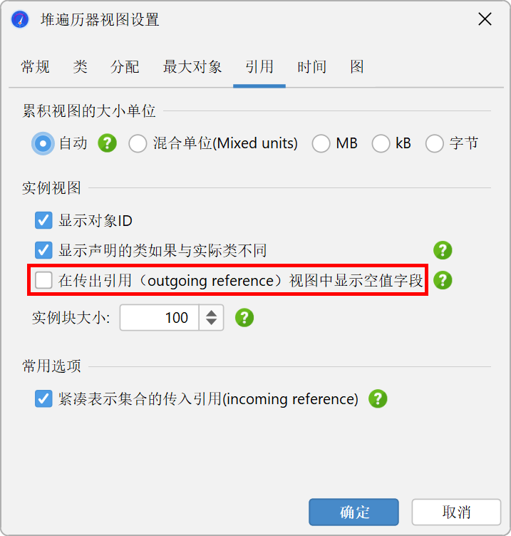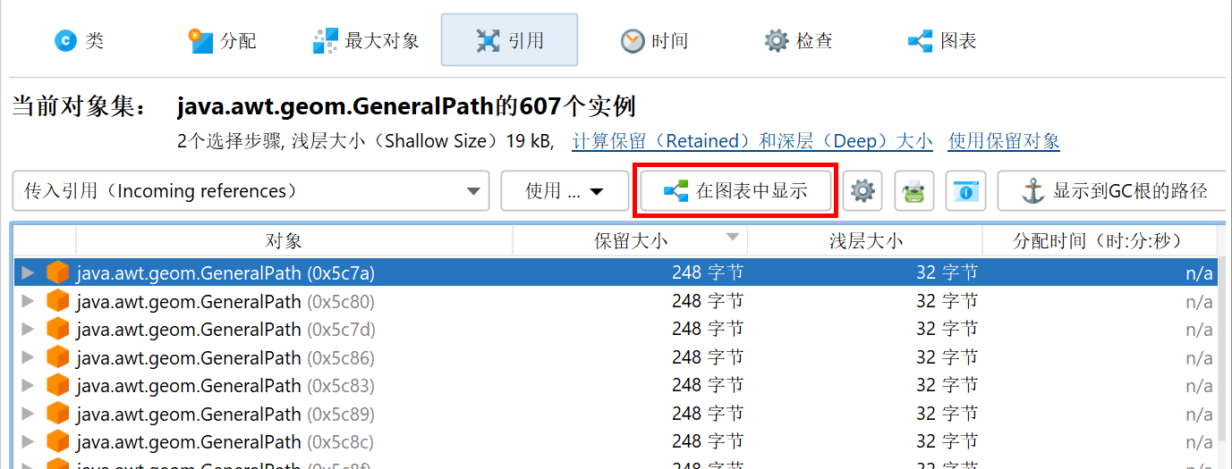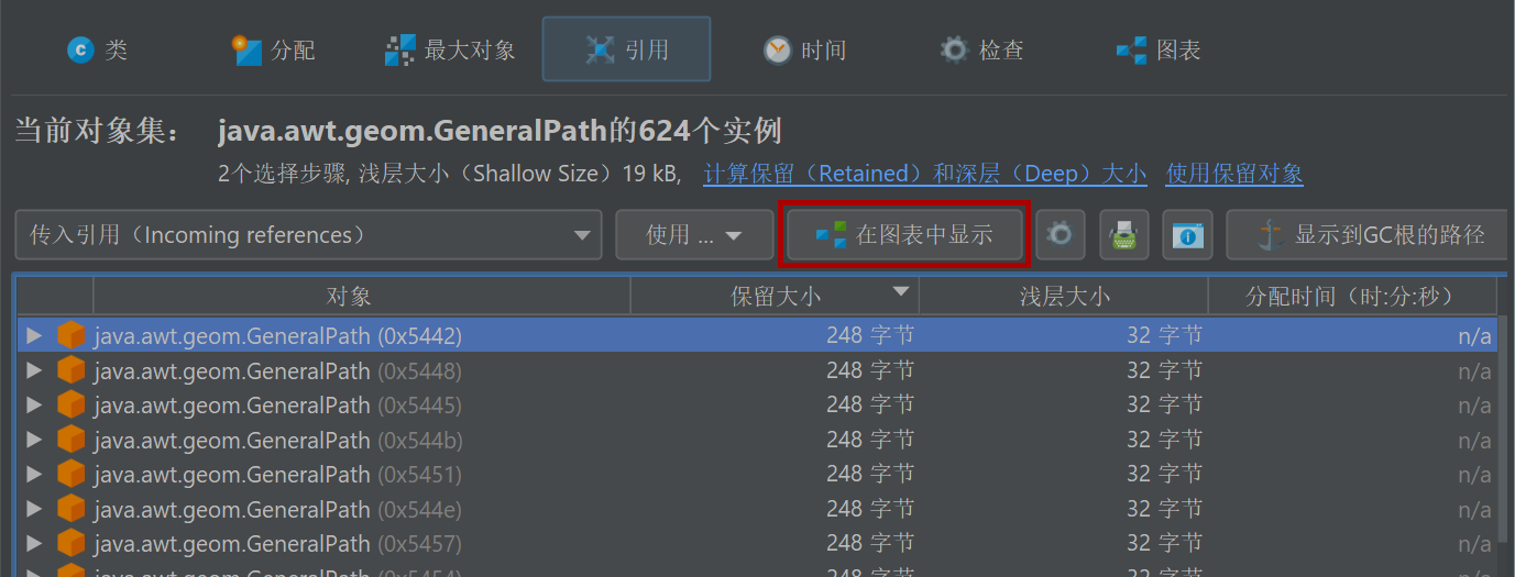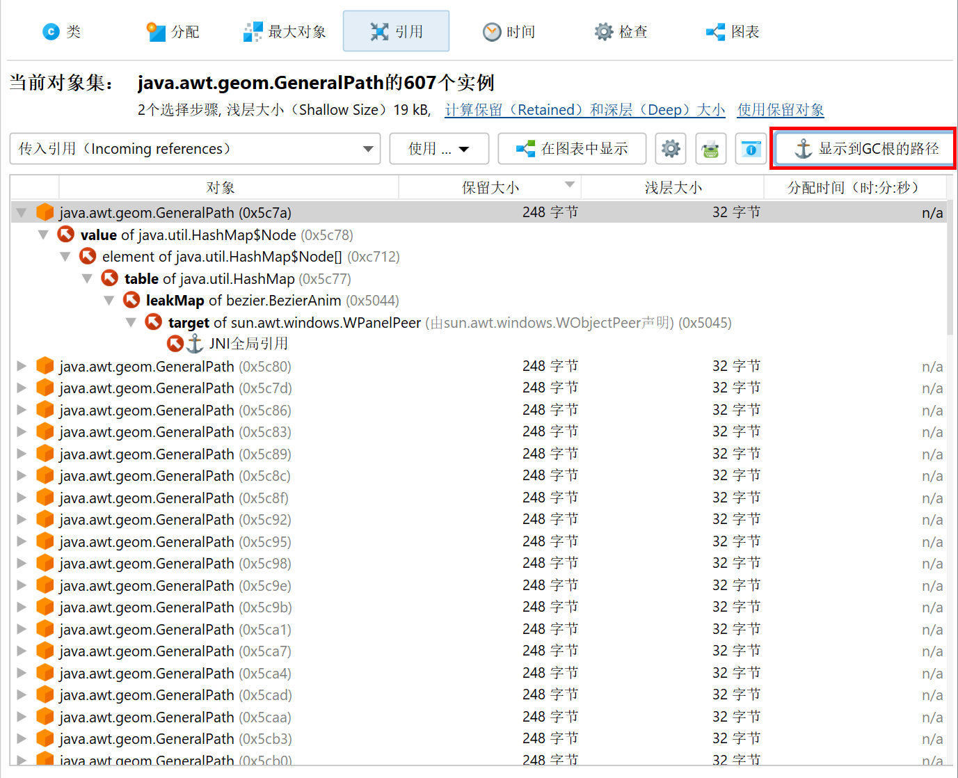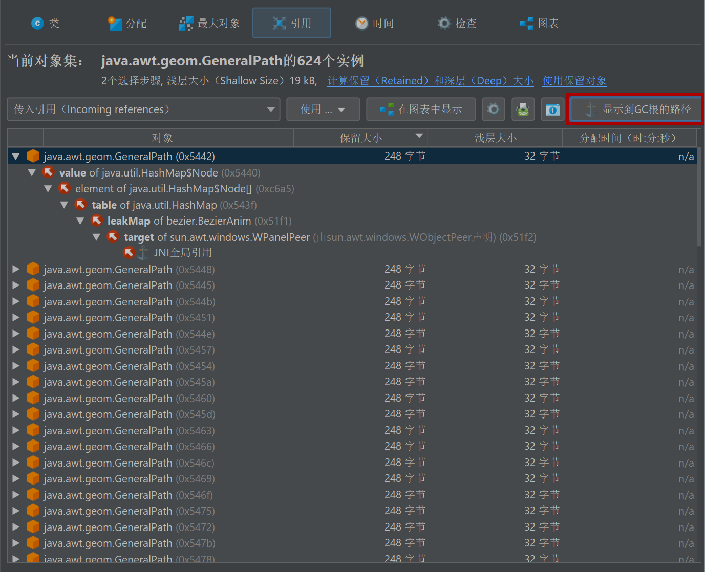 传入引用视图是解决内存泄漏的主要工具。要找出为什么对象没有被垃圾回收,Show Paths To GC Root按钮将找到到垃圾收集器根的引用链。关于这个重要主题的详细信息,请参见内存泄漏章节。