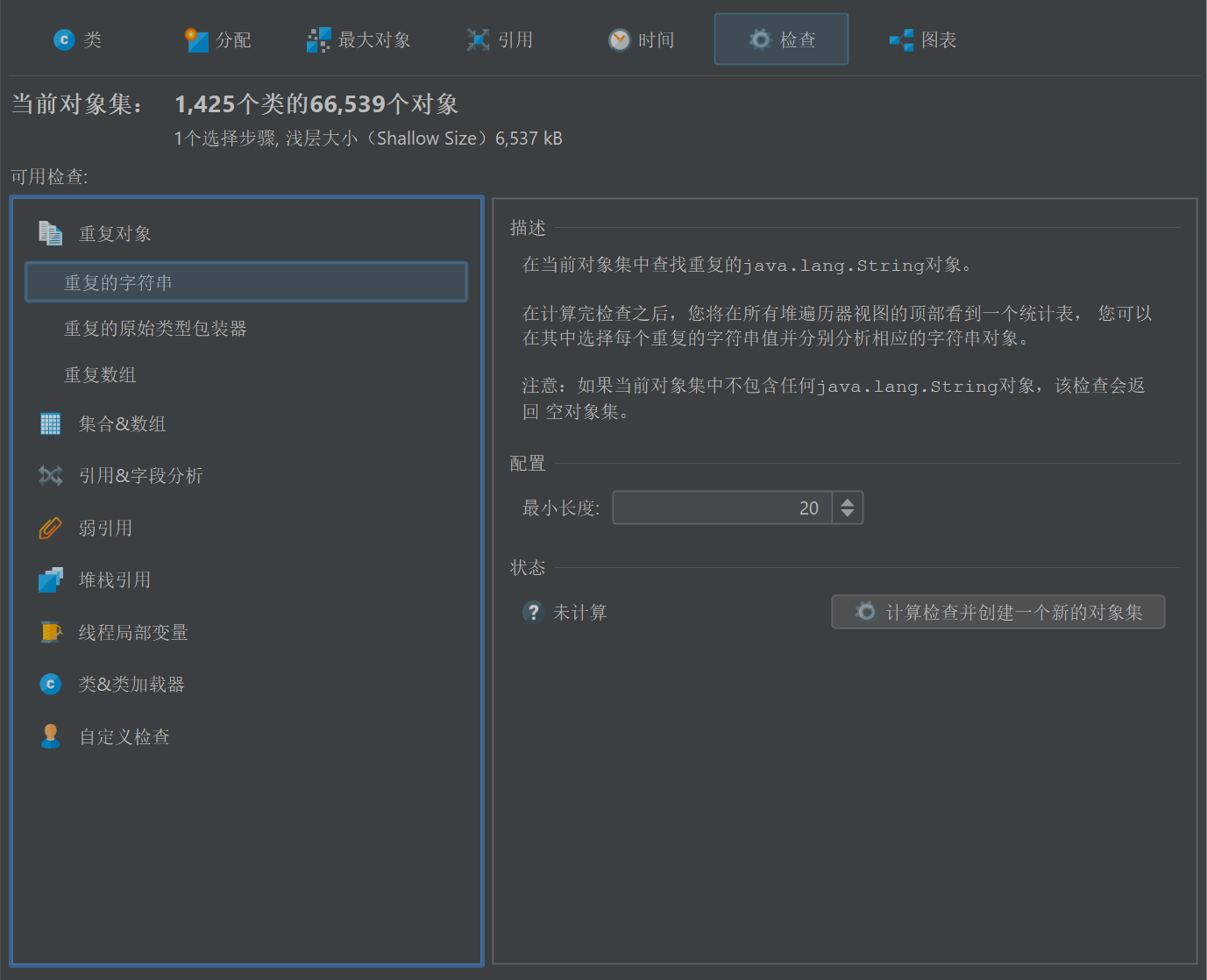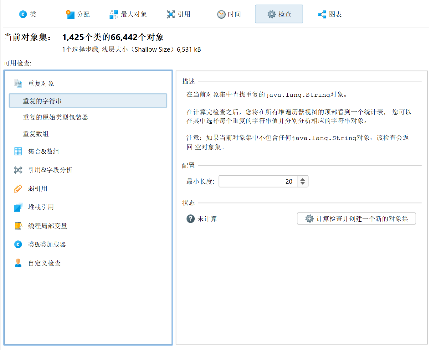 “Inspections”视图本身不显示数据。它提供了一些堆分析,根据其他视图中不可用的规则创建新的对象集。例如,您可能想查看由线程本地保留的所有对象。这在引用视图中是不可能做到的。检查被分为几个类别,并在其描述中进行解释。