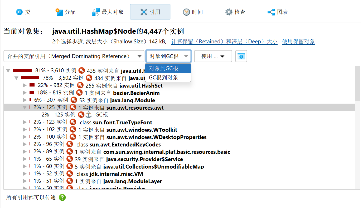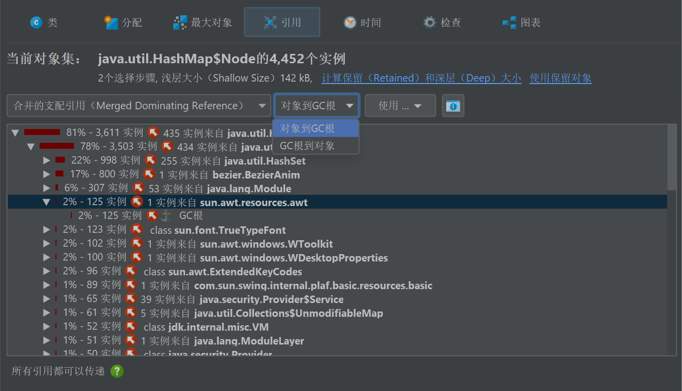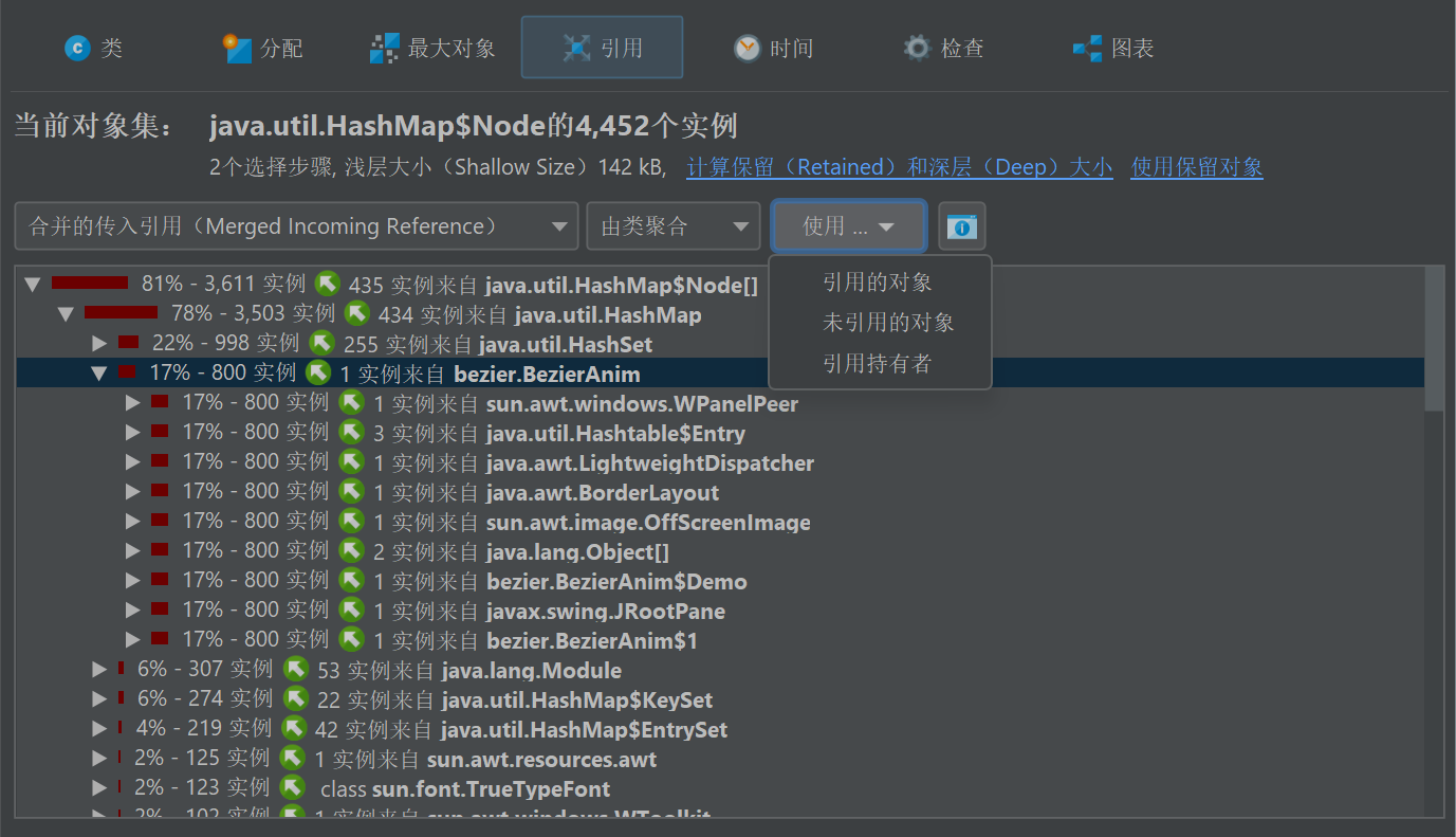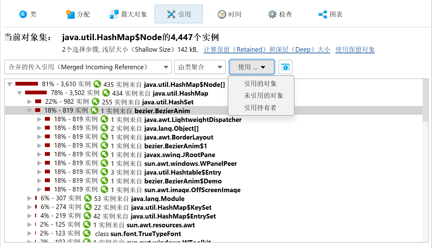 您还可以选择按字段分组显示合并引用。在这种情况下,每个节点都是一个引用类型,例如类的特定字段或数组的内容。对于标准集合,内部引用链会破坏累积,因此您会看到类似“map value of java.lang.HashMap”的引用类型。与类聚合不同,此机制仅适用于JRE标准库中显式支持的集合。