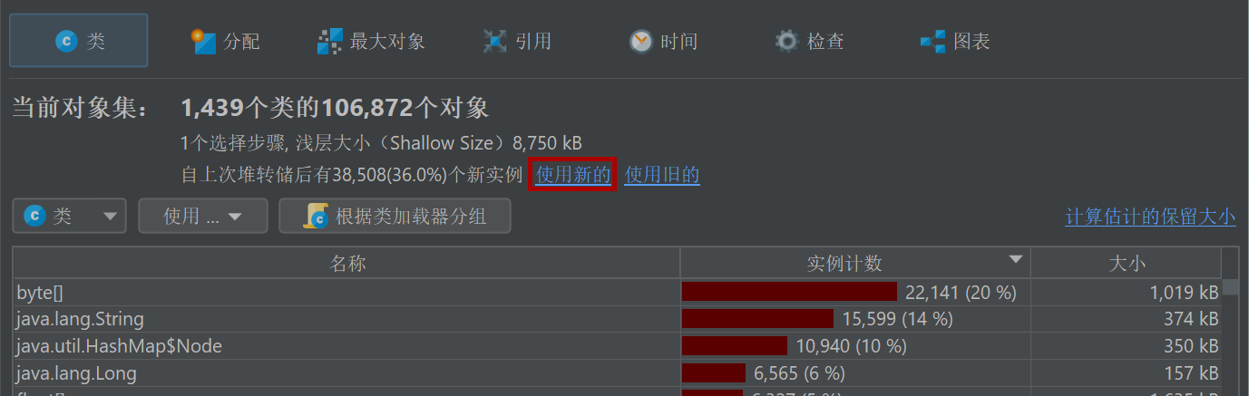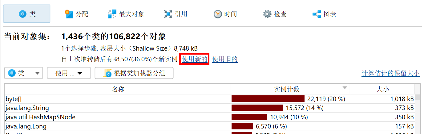 如果存在先前的堆快照或标记堆调用,堆遍历器的标题区域会显示新的实例计数和两个标题为Use new和Use old的链接,允许您选择自那时起分配的实例,或在此之前分配的幸存实例。此信息适用于每个对象集,因此您可以先深入研究,然后选择新实例或旧实例。