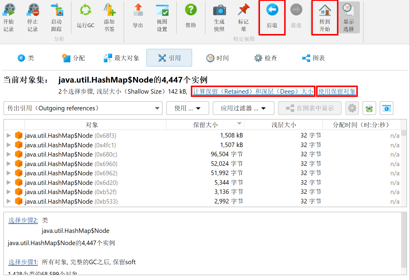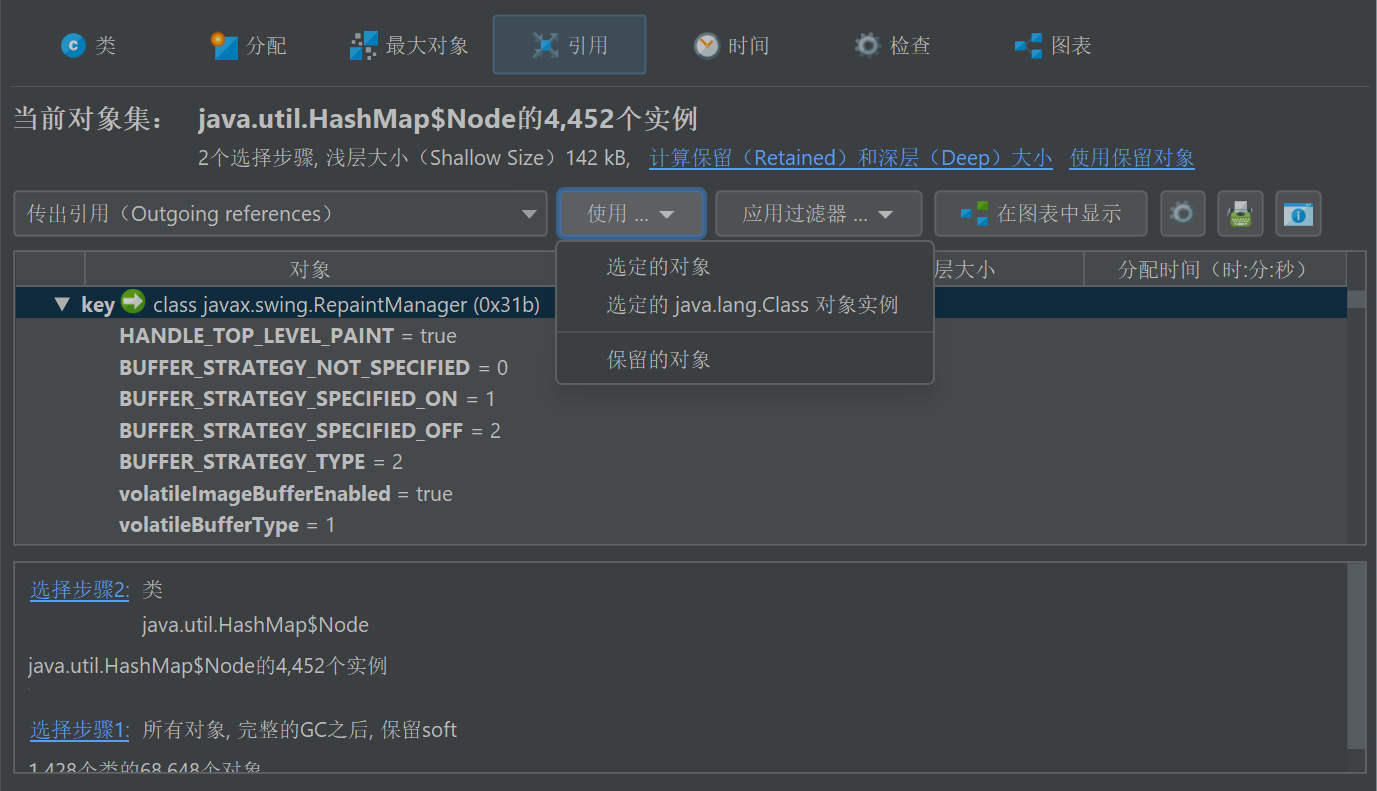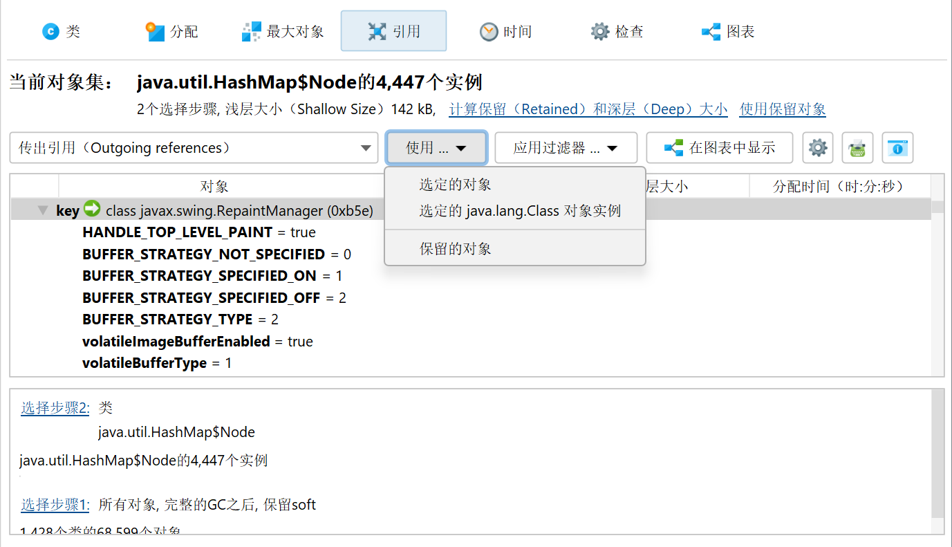 传出引用视图类似于IDE中的调试器会显示的视图。打开对象时,您可以看到原始数据和对其他对象的引用。任何引用类型都可以选择为新的对象集,您可以一次选择多个对象。与类视图一样,您可以选择保留的对象或关联的java.lang.Class对象。如果选定的对象是标准集合,您还可以通过单个操作选择所有包含的元素。对于类加载器对象,有一个选项可以选择所有加载的实例。