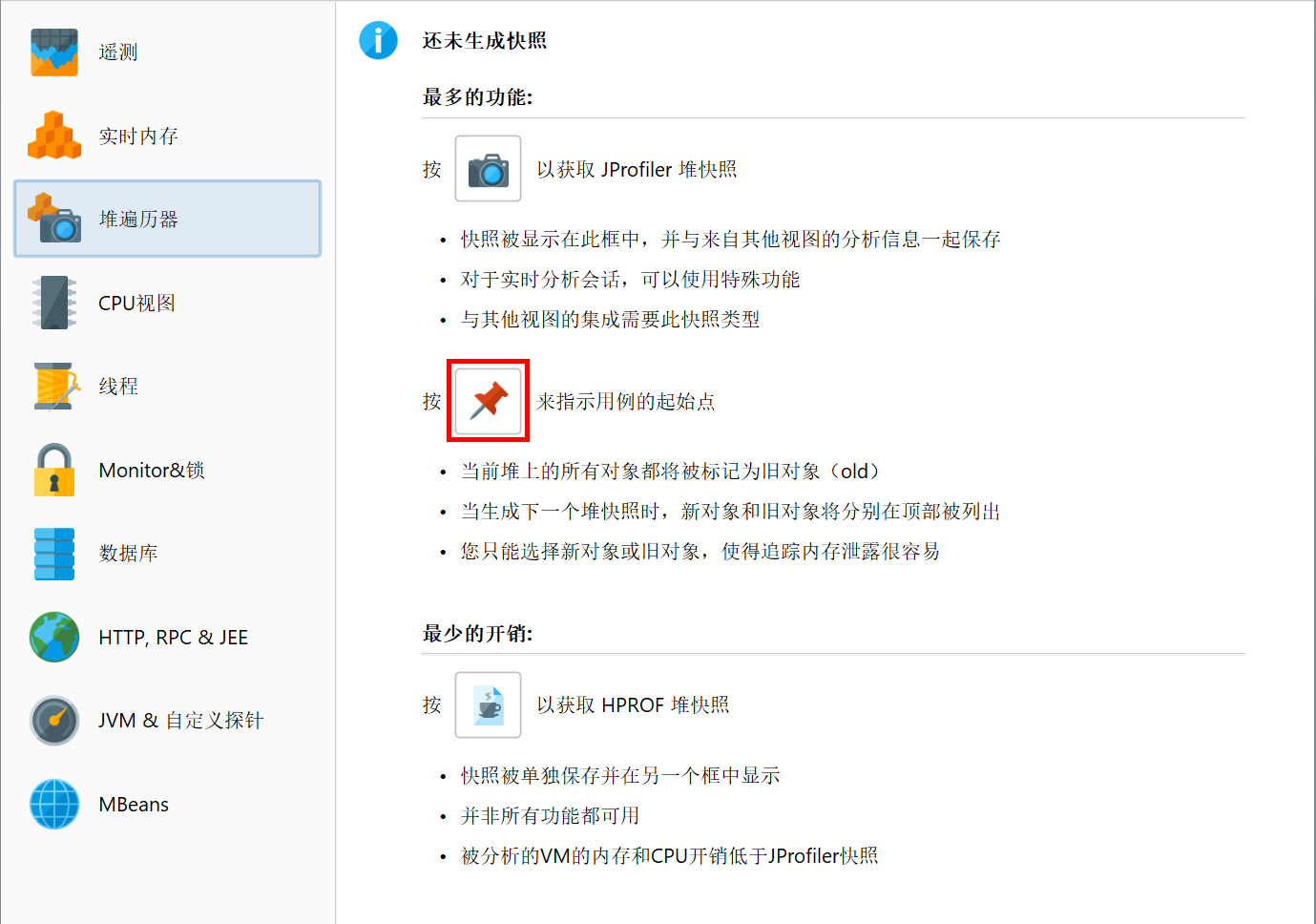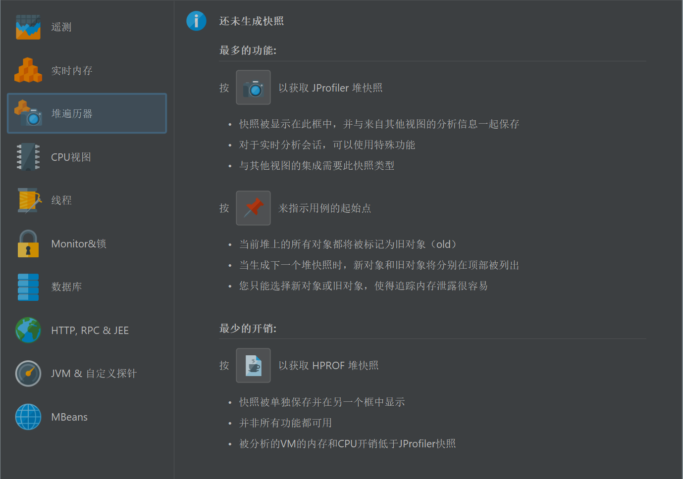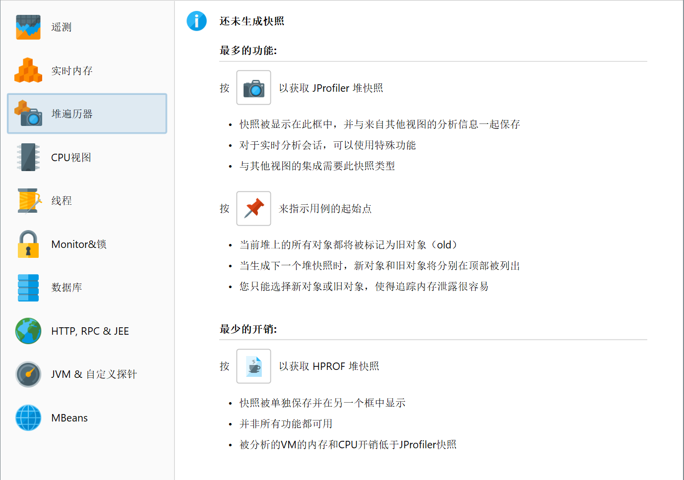 在堆遍历器的概览页面上,您可以选择是创建JProfiler堆快照还是HPROF/PHD堆快照。默认情况下,推荐使用JProfiler堆快照。HPROF/PHD堆快照在另一章中讨论的特殊情况下很有用。