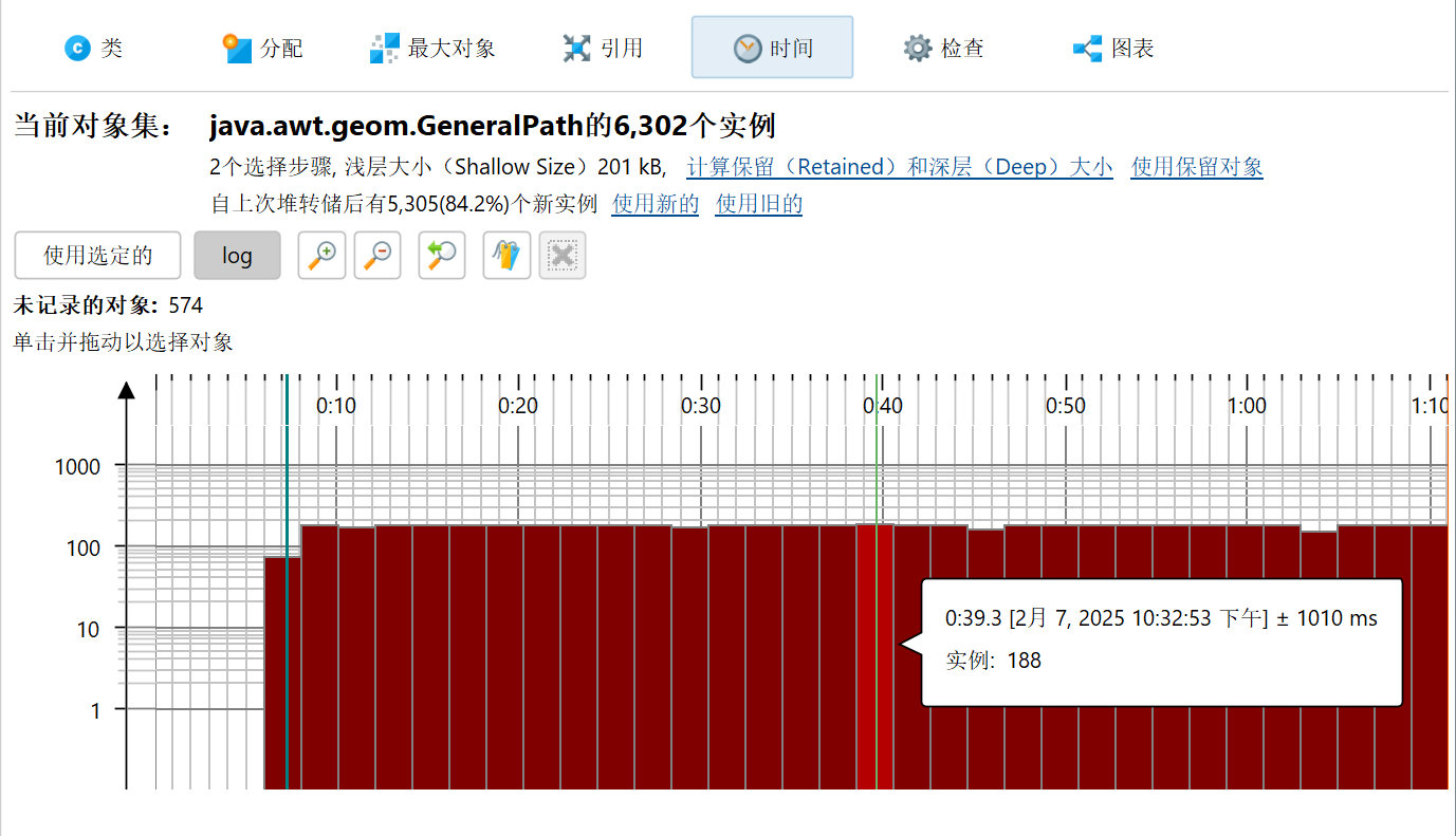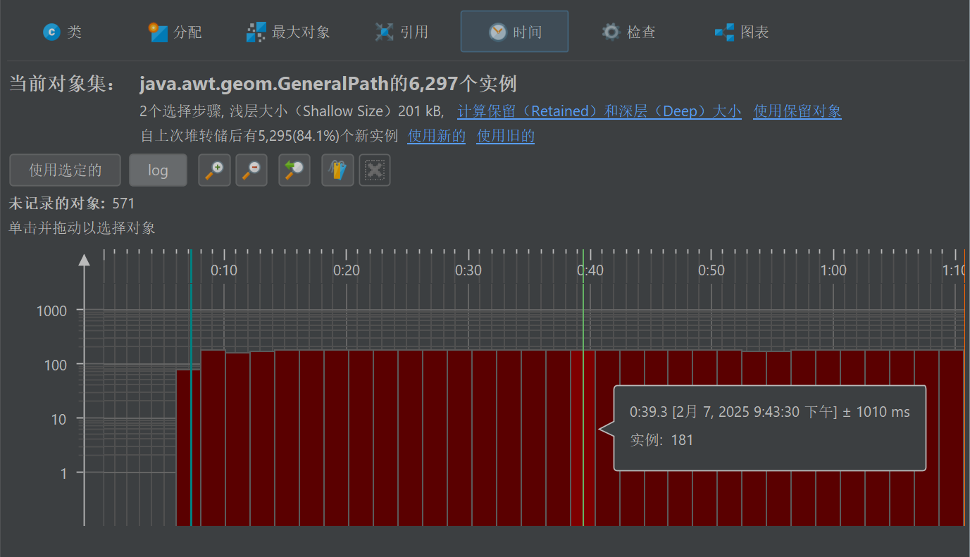 JProfiler在记录分配时可以保存的另一条信息是对象分配的时间。堆遍历器中的“Time”视图显示当前对象集中所有记录实例的分配时间直方图。您可以单击并拖动以选择一个或多个间隔,然后使用Use Selected按钮创建一个新的对象集。