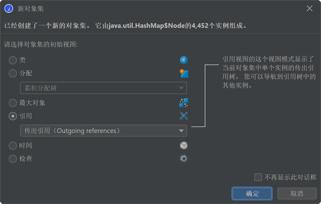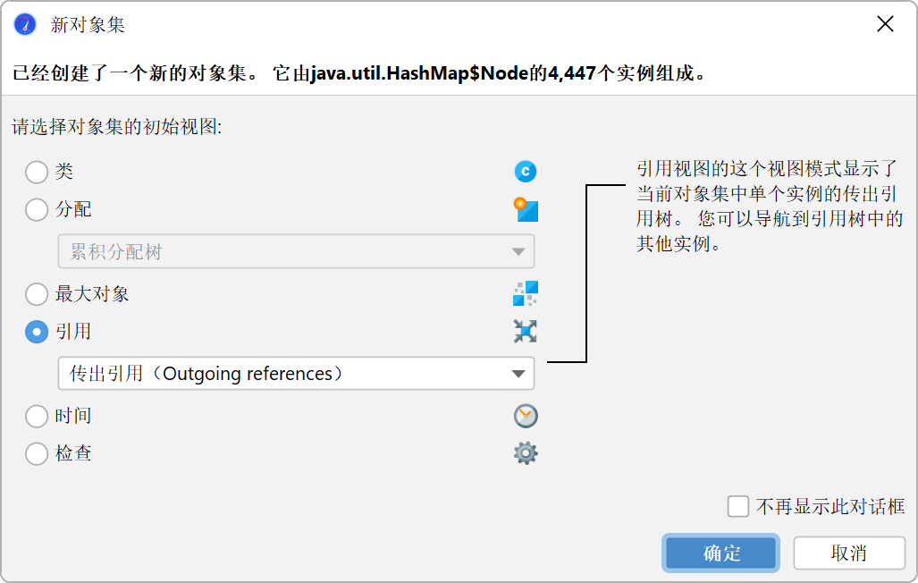 对于新的对象集,显示堆遍历器的类视图并不有趣,因为它实际上只是将表过滤到先前选择的类。相反,JProfiler建议使用“New object set”对话框中的另一个视图。您可以取消此对话框以放弃新对象集并返回到上一个视图。建议使用传出引用视图,但您也可以选择其他视图。这只是最初显示的视图,您可以在堆遍历器的视图选择器中切换视图。