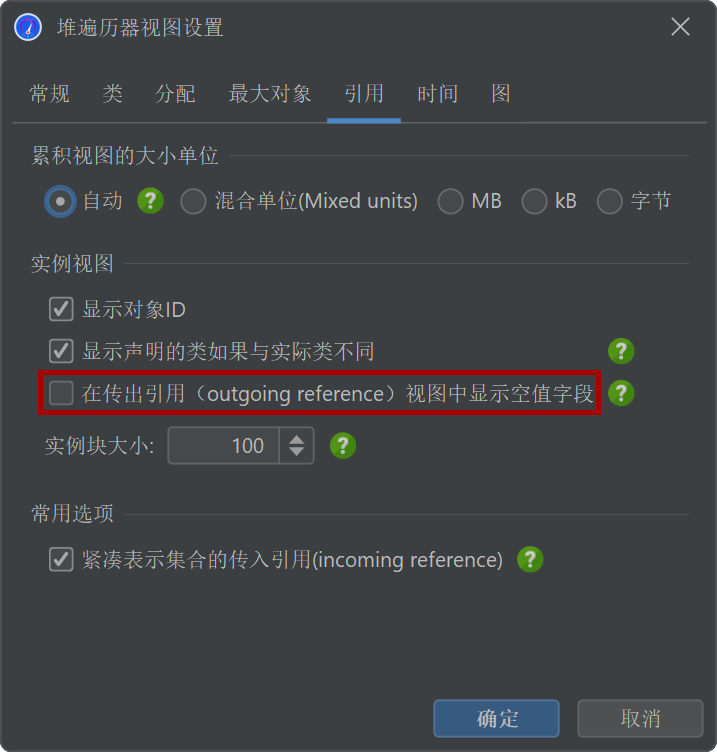 默认情况下,不显示具有空引用的字段,因为该信息可能会分散内存分析的注意力。如果您想出于调试目的查看所有字段,可以在视图设置中更改此行为。