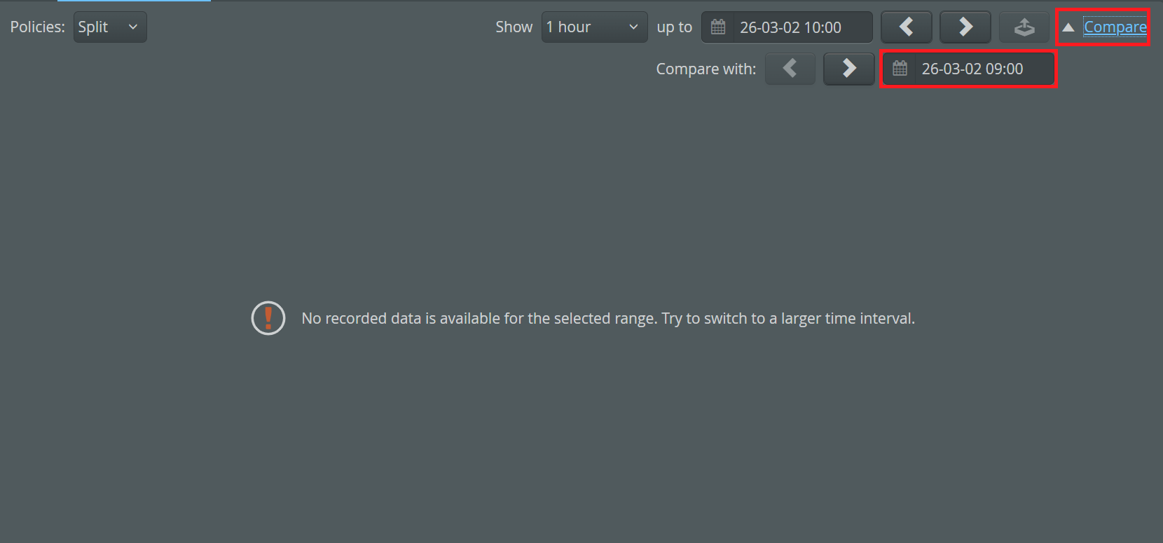 The first interval is set to the interval just preceding the second interval. New navigation buttons are shown that let you adjust the first interval as required. With the date and time chooser you can jump back to arbitrary points in time.
