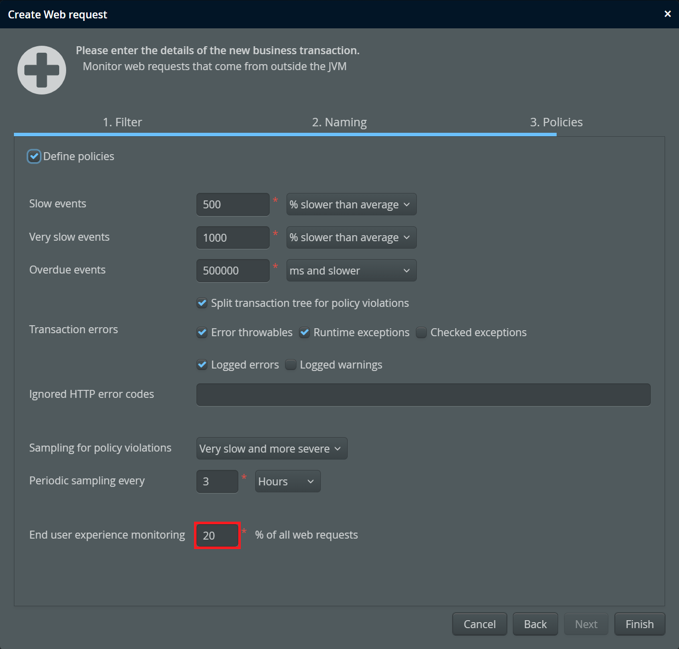 Typically, you do not need page load times from all HTTP requests that create HTML pages, so you just sample a particular percentage. This percentage value can be configured in the policies configuration of web transactions. To disable this feature, set the percentage value to 0%.