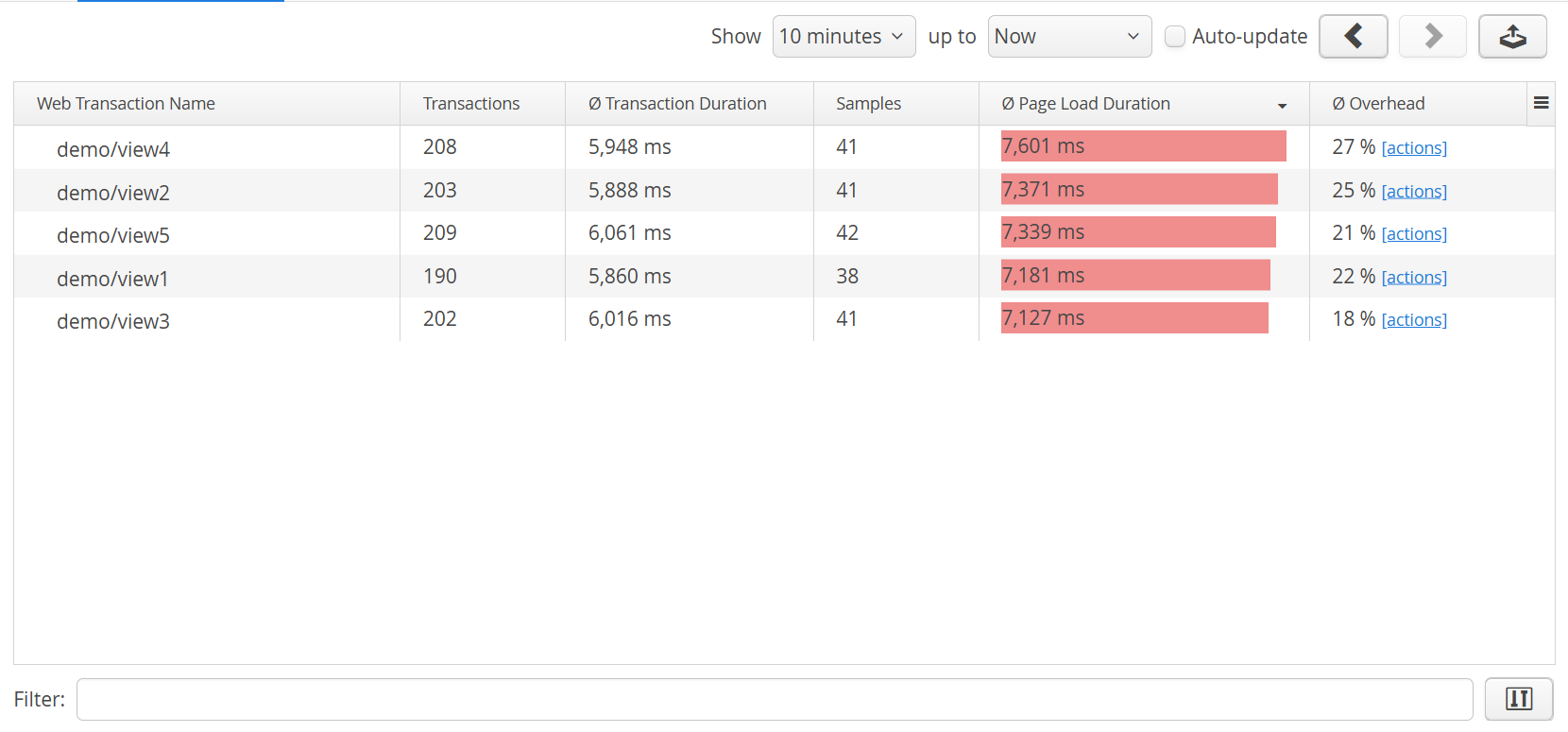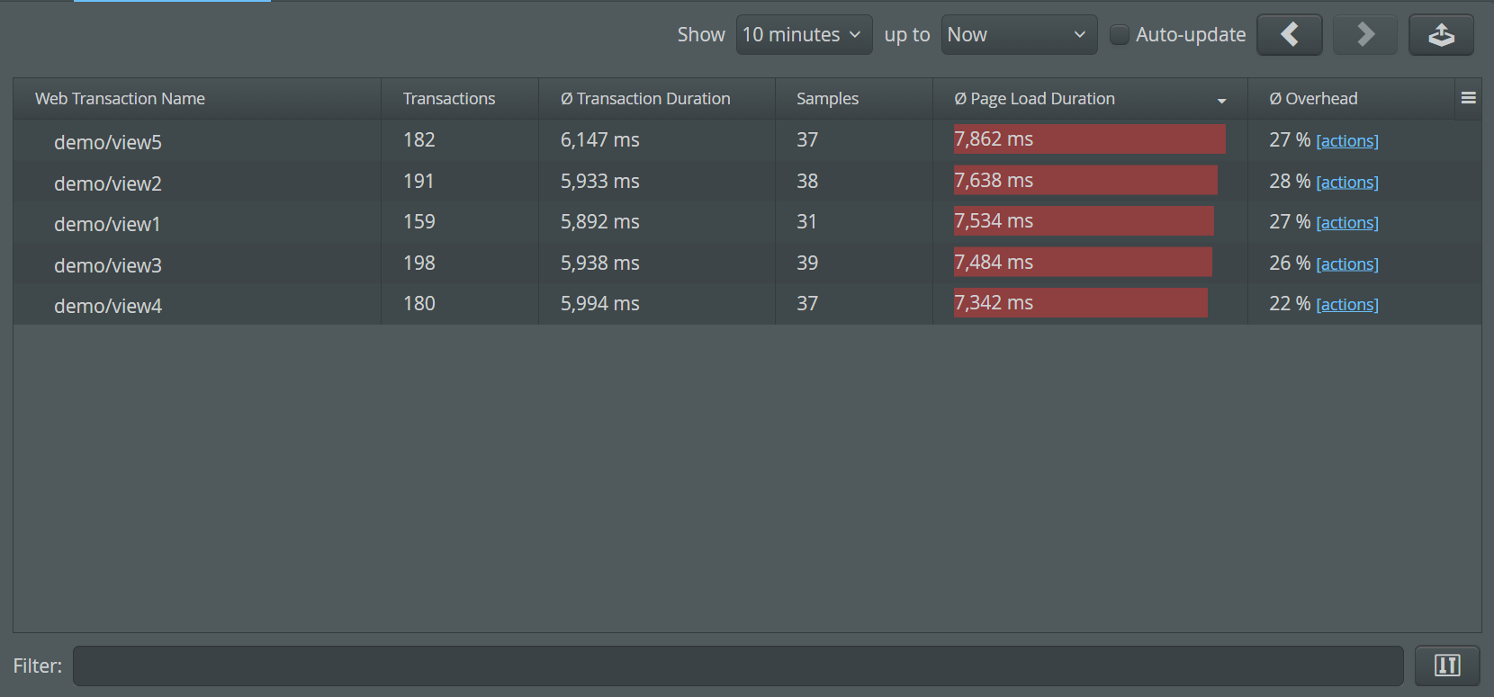 From the ratio of the page load duration and the transaction execution time, an overhead column is calculated. The "Samples" column shows you how many measurements were taken, while the "Transactions" column contains the total number of transactions. Their ratio should correspond to the sampling percentage above. It can be slightly lower due to incomplete page loads and browsers that do not support the Web Performance API. To get better statistics, switch the time range to a longer interval.