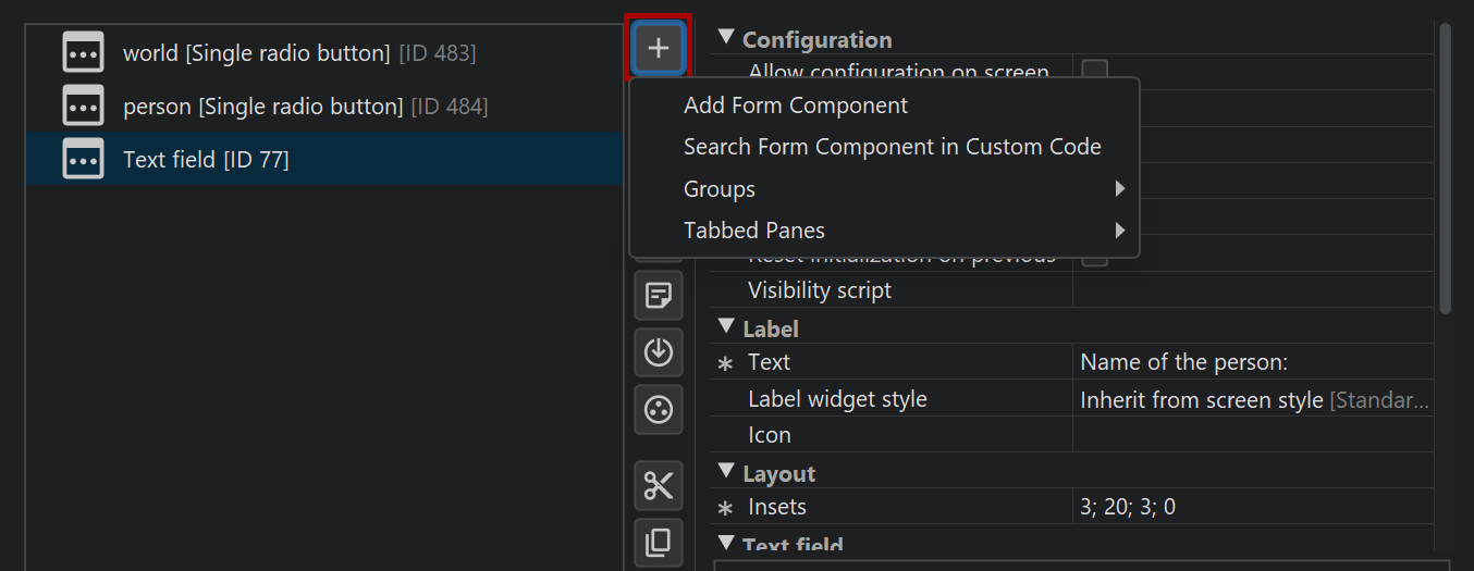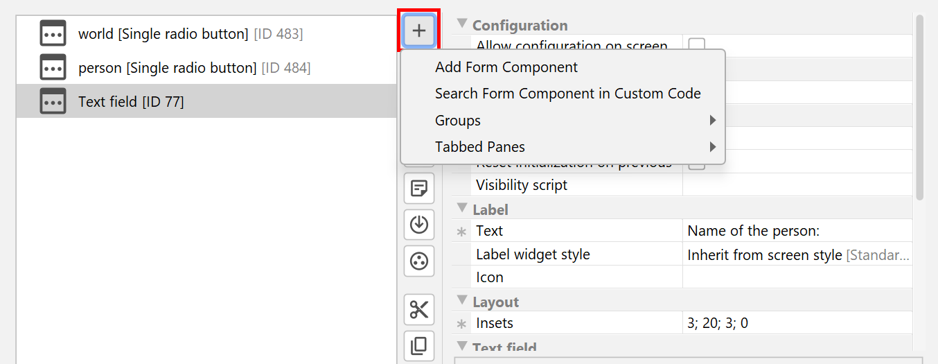 A number of radio buttons in a common button group with an optional leading label. The user selection (the selected index as a java.lang.Integer) is saved to a variable.